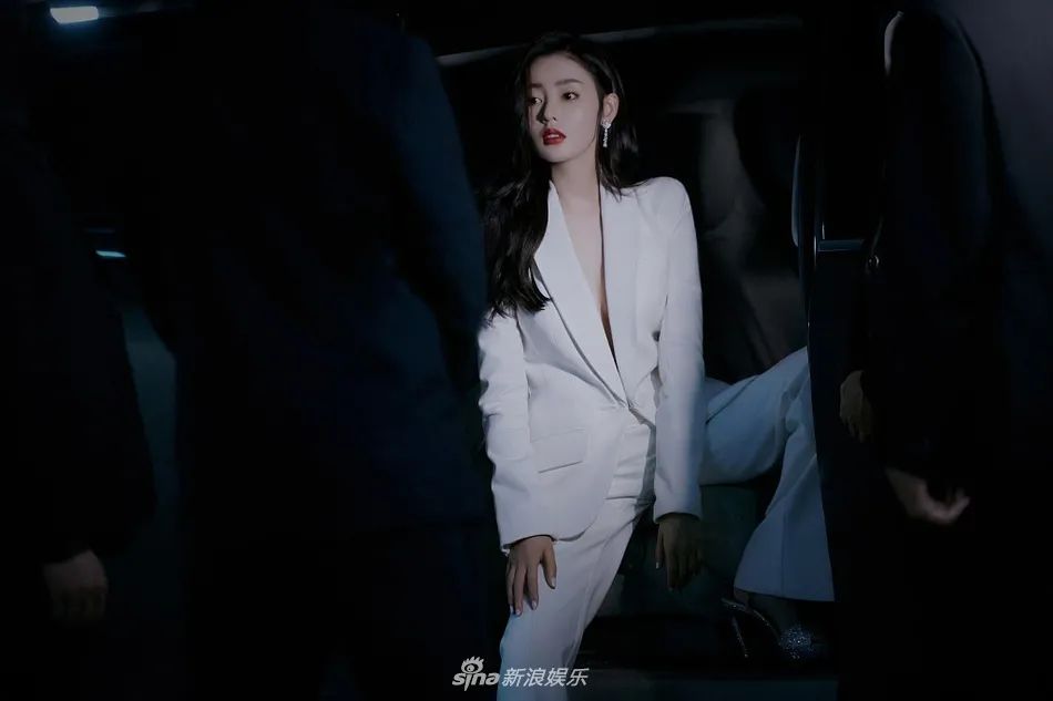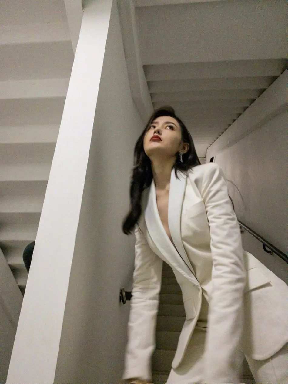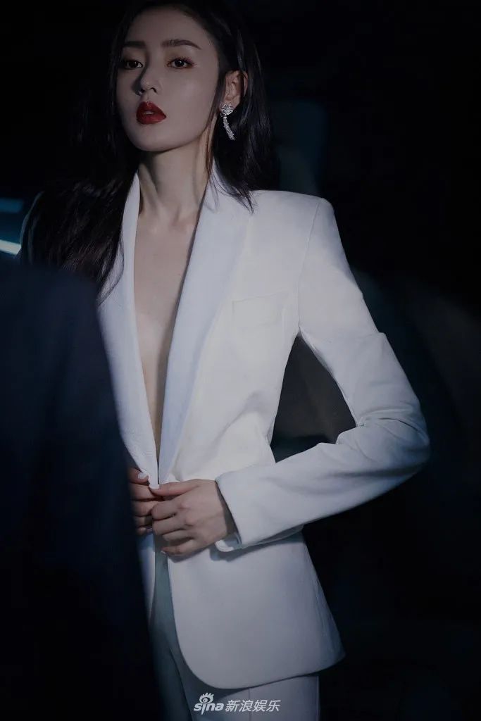 张天爱身穿白色真空西装性感酷飒,妩媚眼神撩人于无形,她五官精致,烈焰红唇,大秀自己的事业线,还是很性感迷人的。