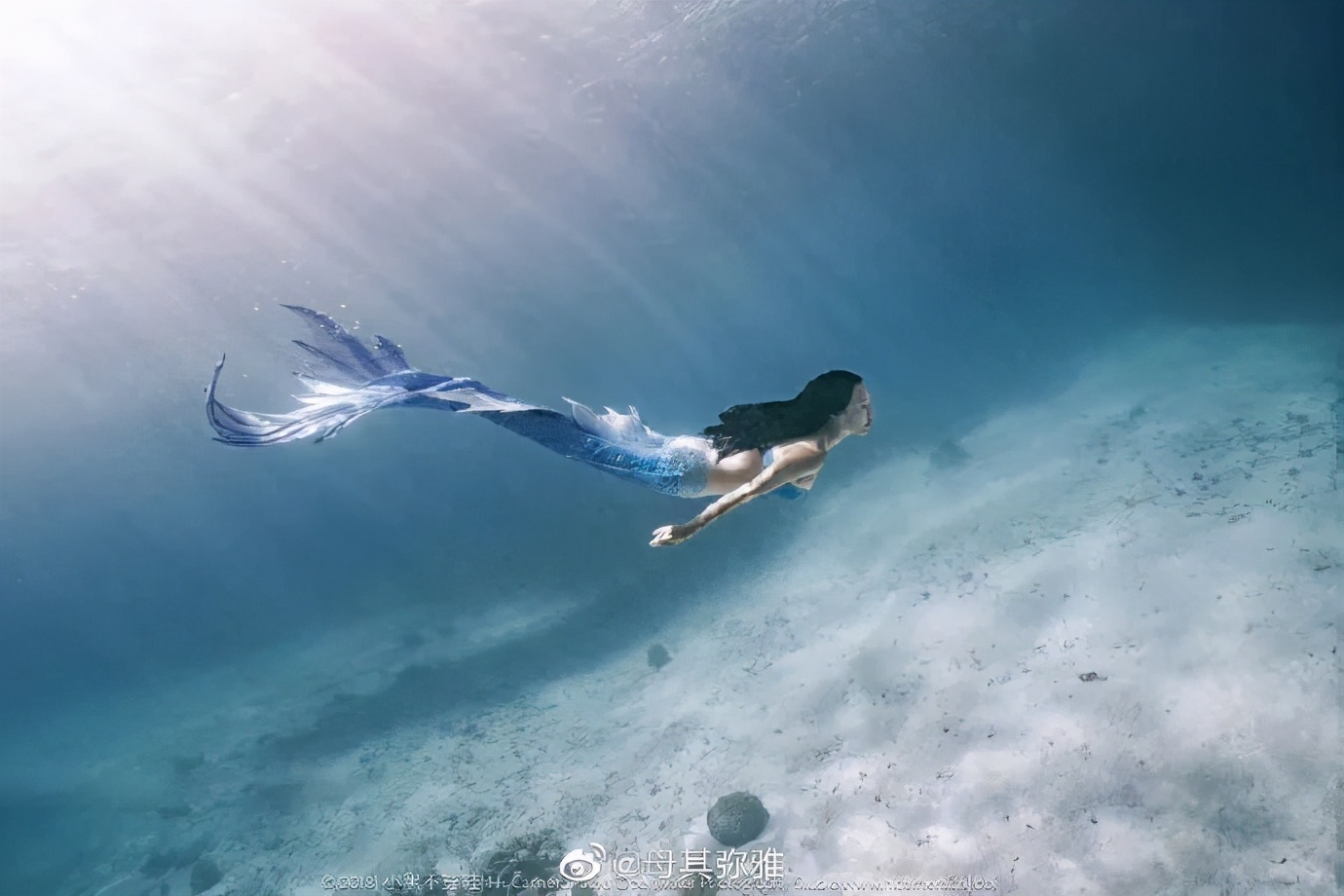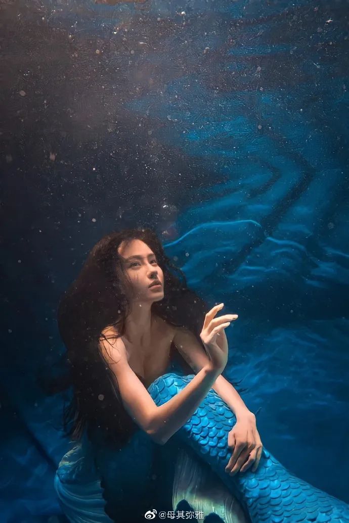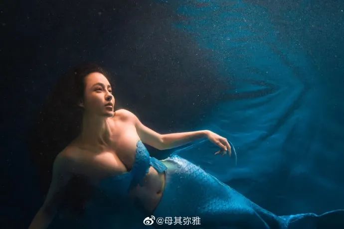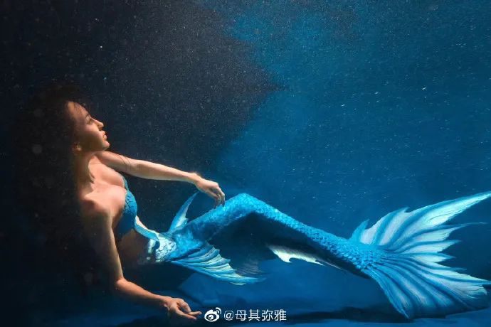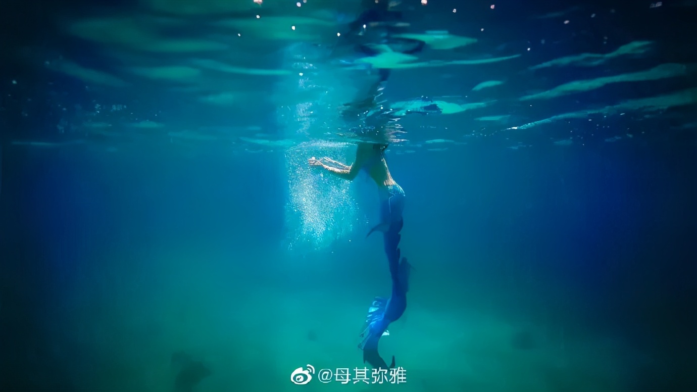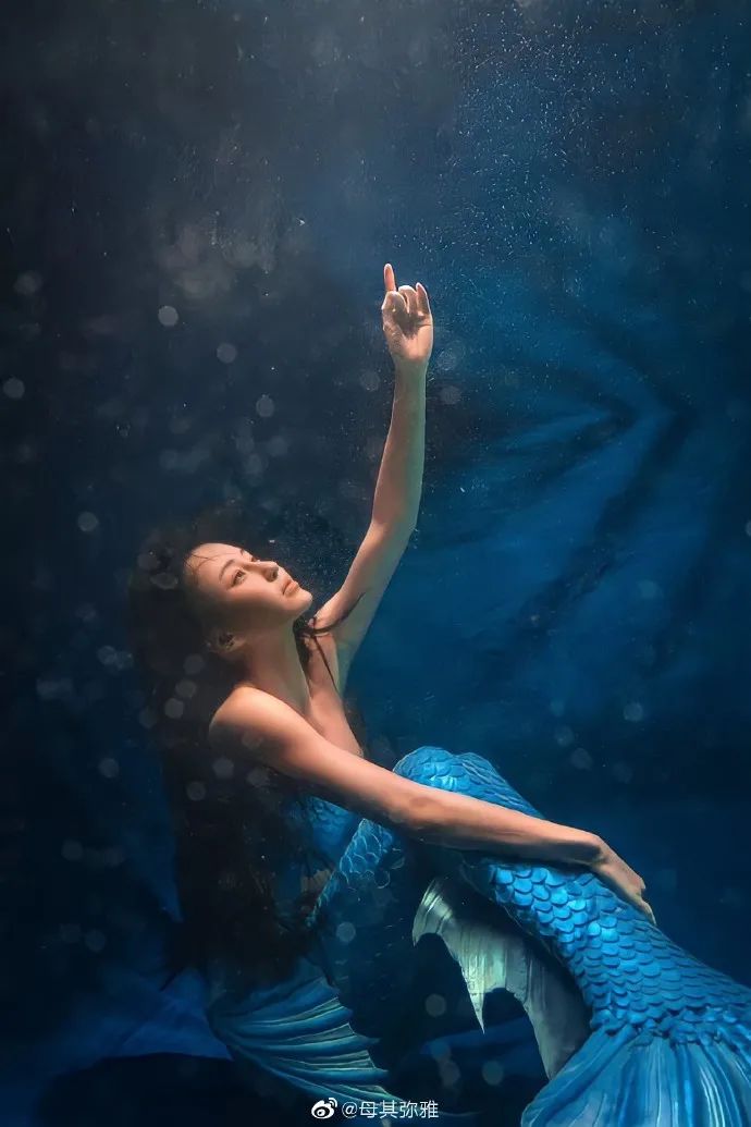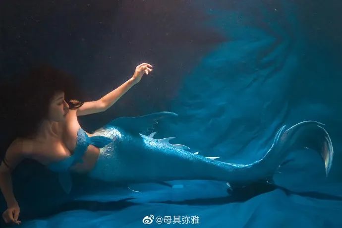 母其弥雅穿着蓝色美人鱼服装,潜水在水下,她大秀自己的香肩,性感妩媚。她还伸手指点水中的泡沫,美得让人窒息。