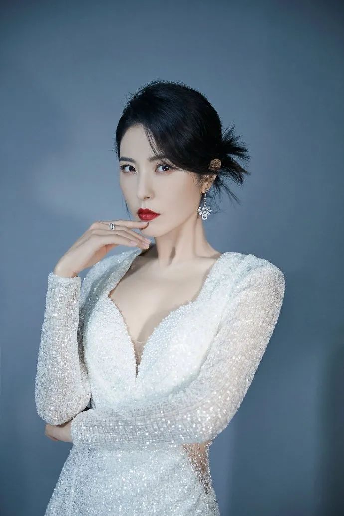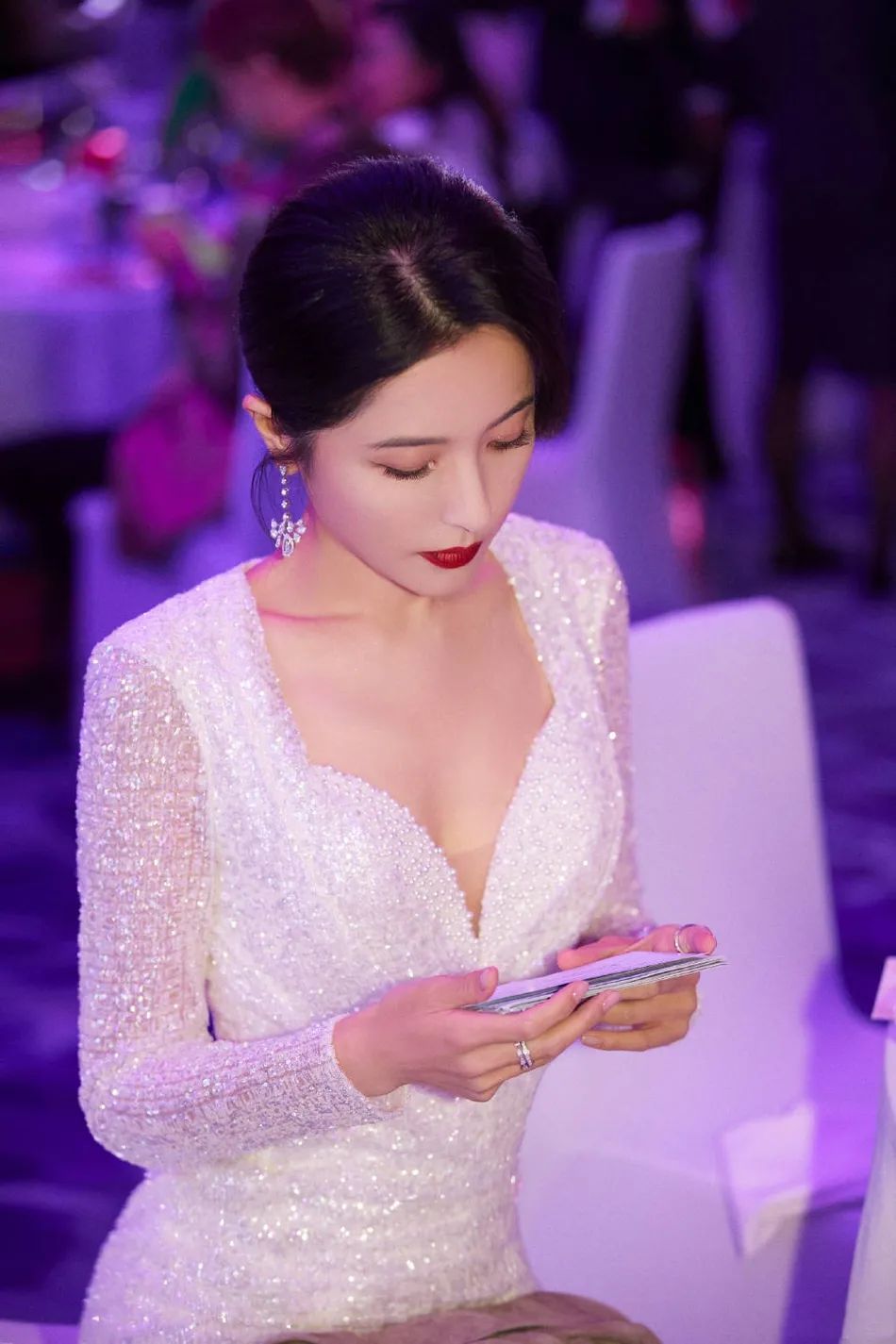 曾黎身穿一身深V亮片白裙,她俏脸妩媚,五官精致,浓眉大眼,烈焰红唇,大秀自己傲人的事业线,这位美女肌肤白皙,身材曼妙,绝对性感迷人。