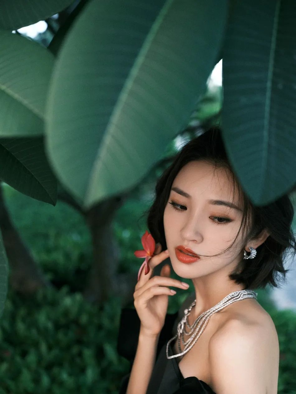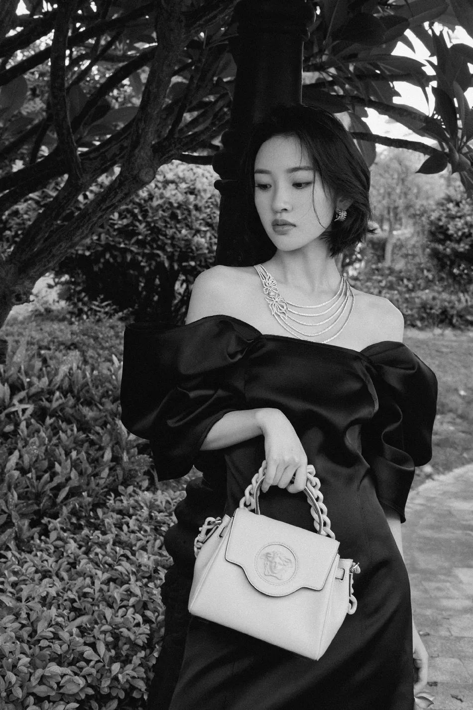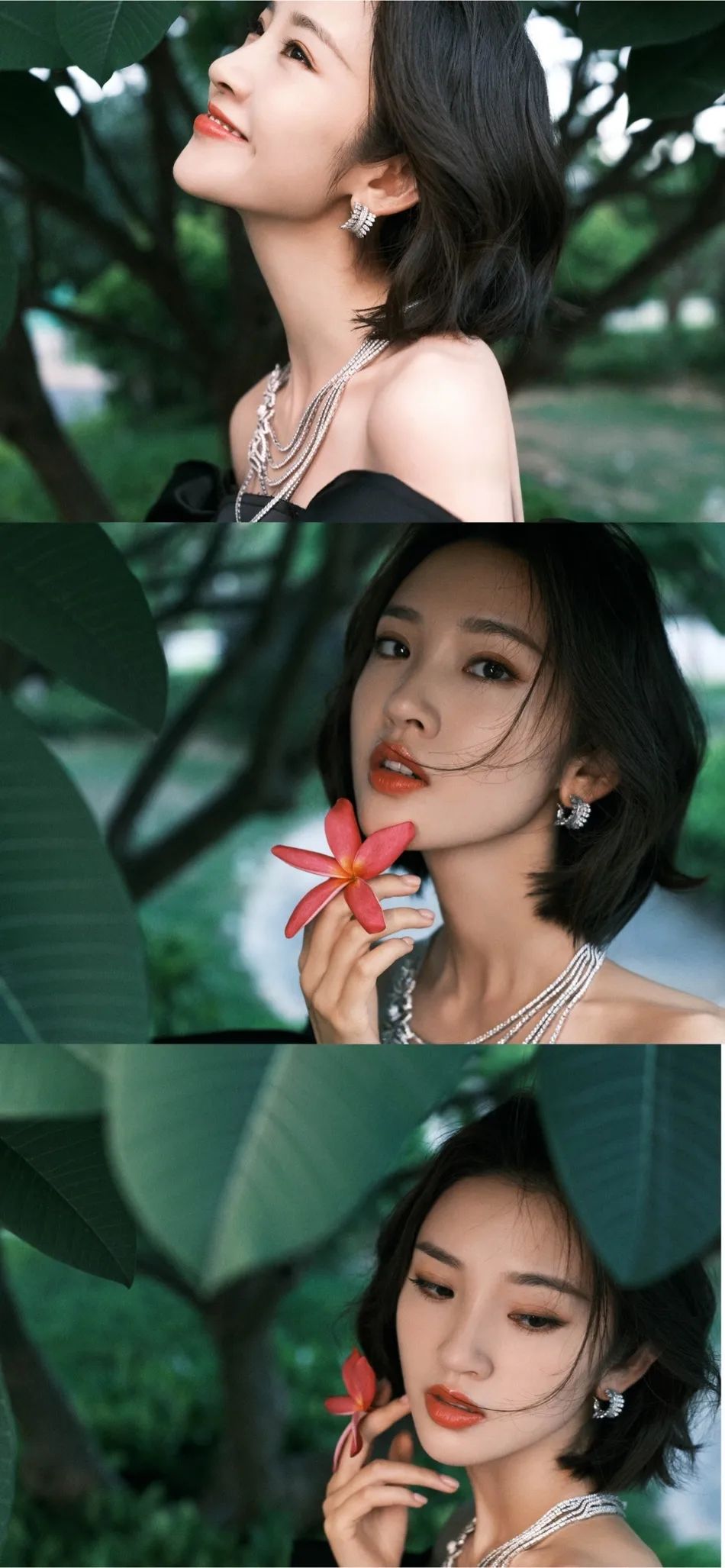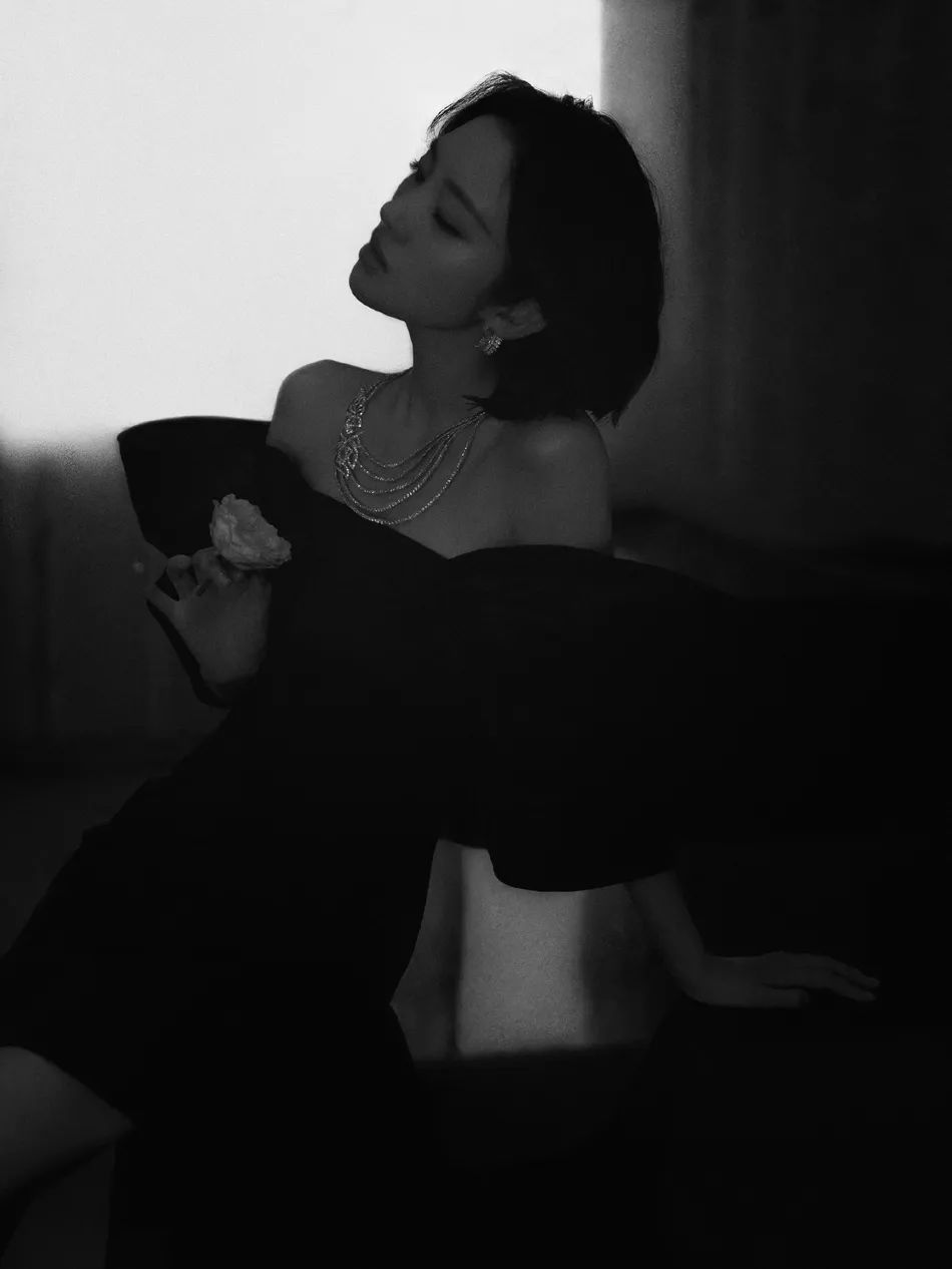 唐艺昕穿着黑色蝴蝶结露肩短裙,她俏脸清纯,秀眸灵动,眉清目秀,樱桃小嘴,短发飘逸。她举着一朵小花,特意露出左边的香肩,肌肤白皙如雪,美得让人窒息。