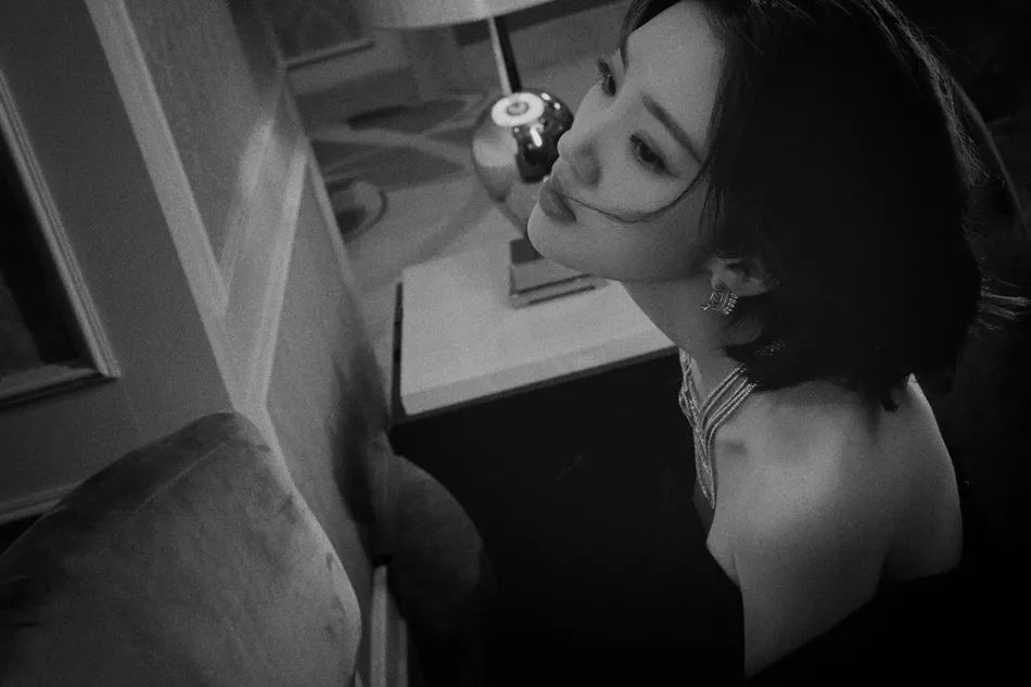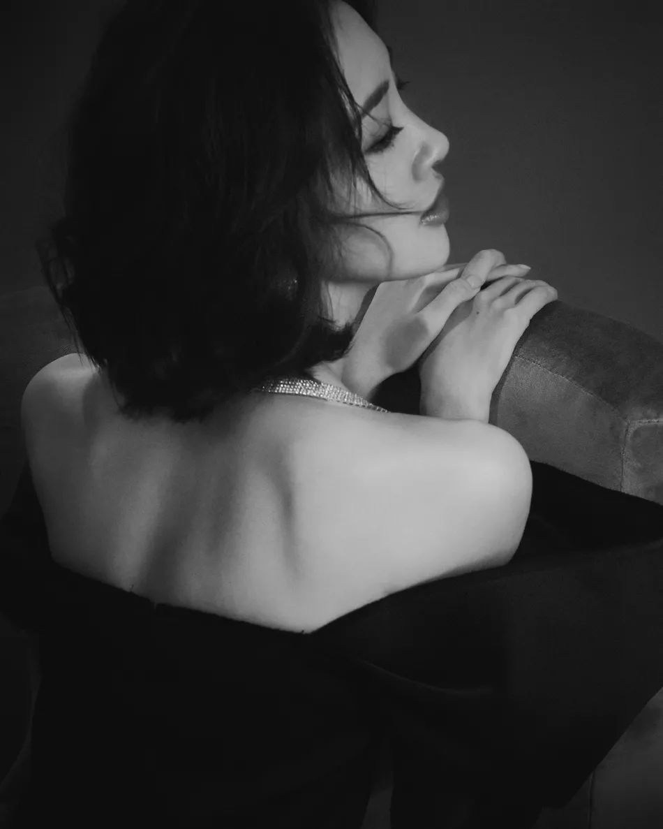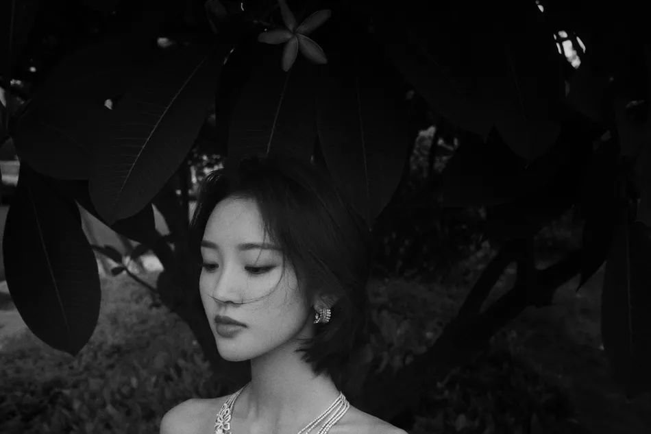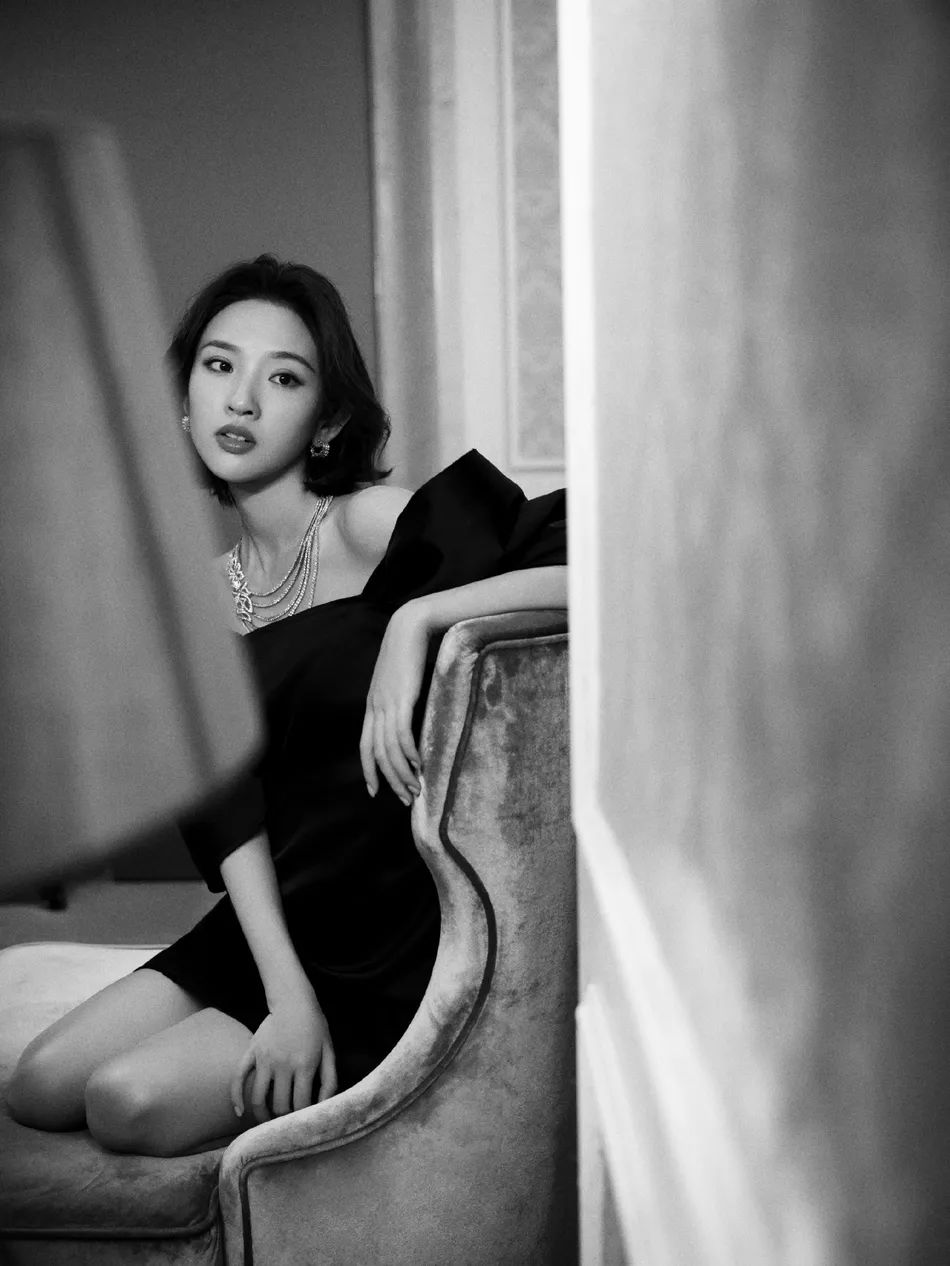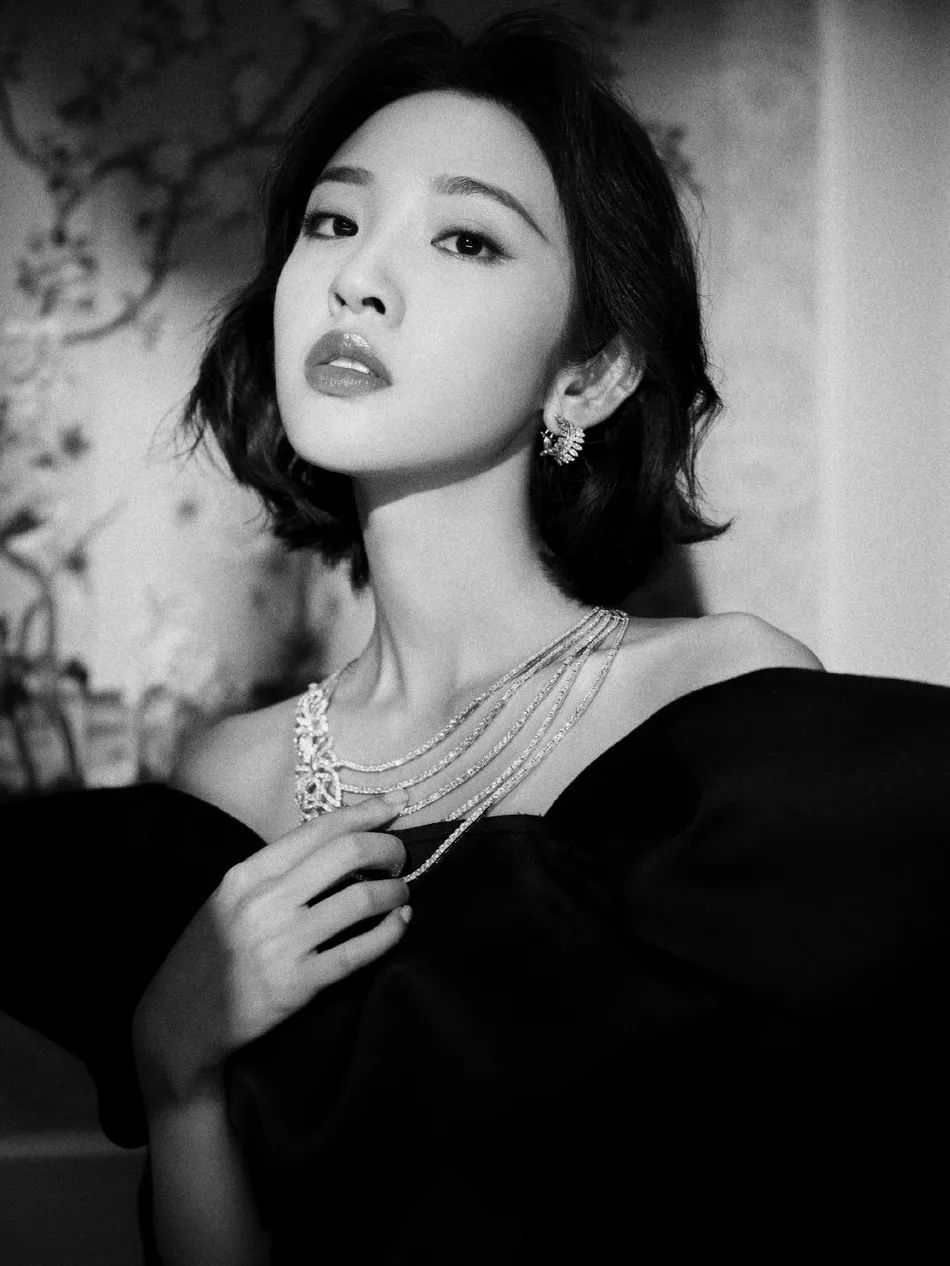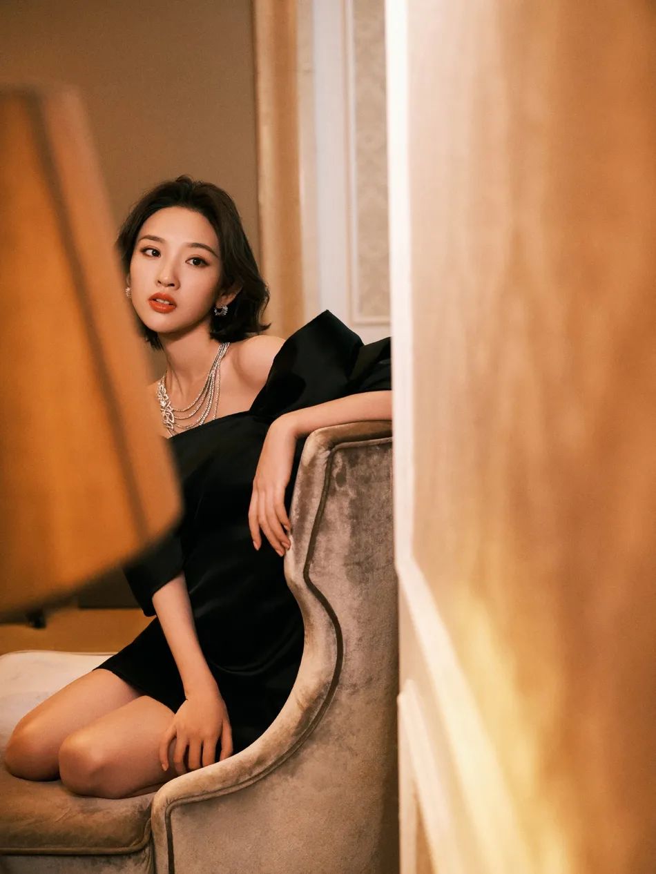 唐艺昕穿着黑色蝴蝶结露肩短裙,她俏脸清纯,秀眸灵动,眉清目秀,樱桃小嘴,短发飘逸。她举着一朵小花,特意露出左边的香肩,肌肤白皙如雪,美得让人窒息。