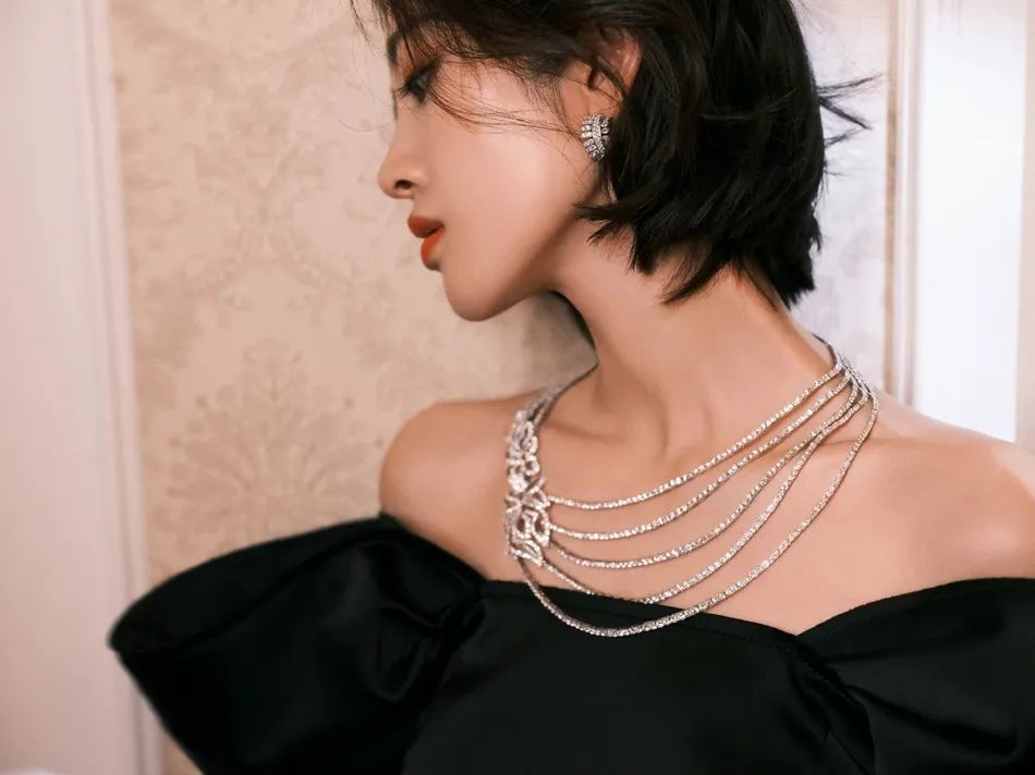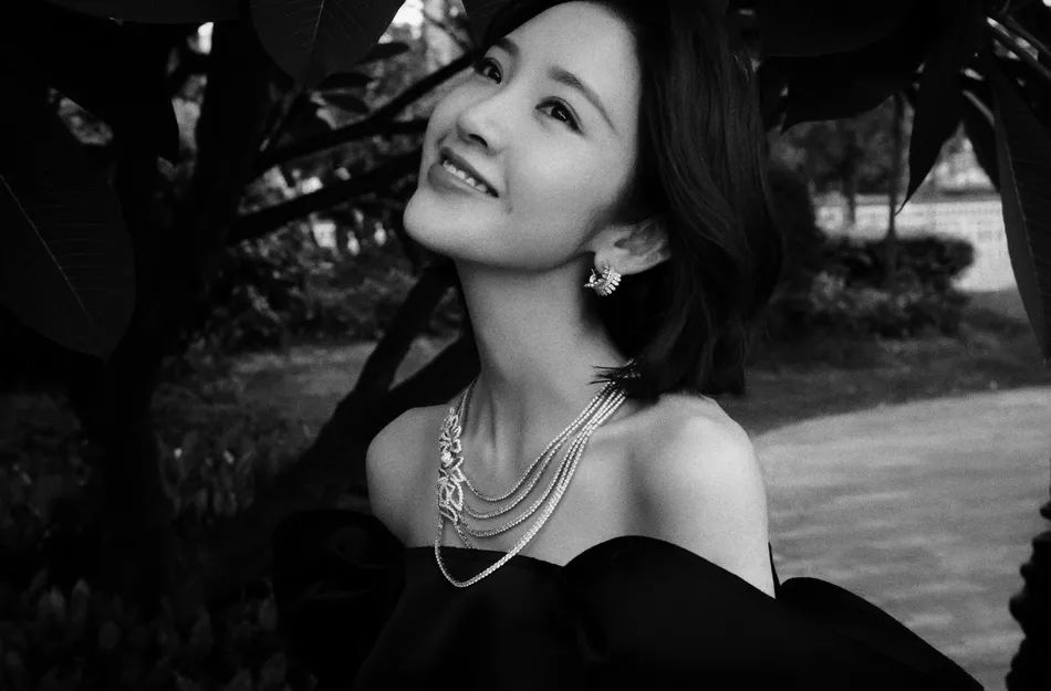 唐艺昕穿着一袭抹胸黑色裙,脖子上戴着大项链,她俏脸清纯,秀眸如水,笑容甜美,唇红齿白,大秀自己的白皙的香肩,美得让人心动。
