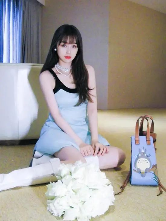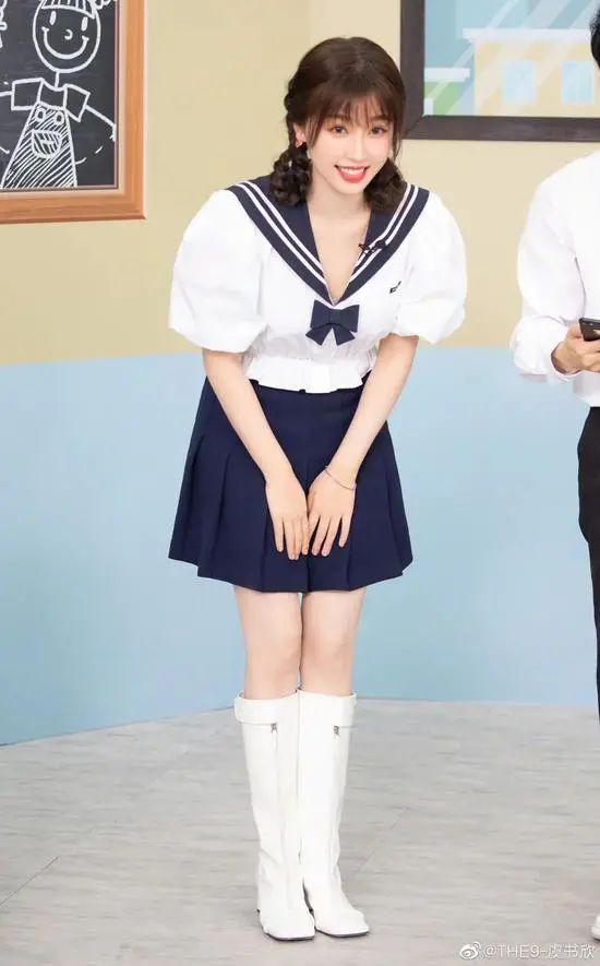 虞书欣穿着学生服,搭配蓝色小短裙,她半弯着腰身,秀眸如水,微微一笑很倾城,一双筷子般的大美腿,还是很性感撩人的。