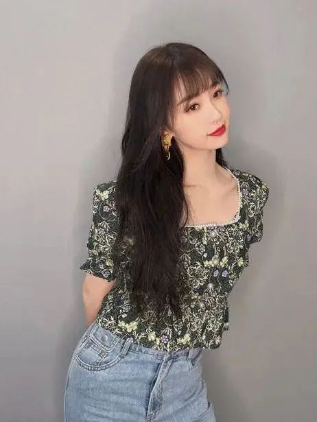 虞书欣这张美图,穿着绿色碎花上衣,搭配牛仔裤,她甜美的脸颊很可人,双手背在身后,乌黑的秀发飘逸如瀑布,美得让人心动。