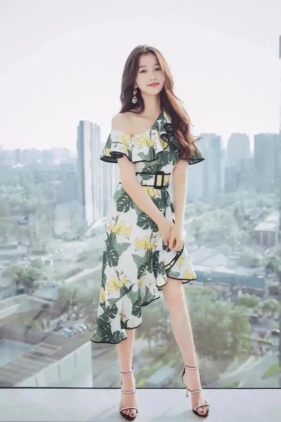 虞书欣穿着绿色花裙,她俏脸妩媚,秀眸灵动,露出右边的香肩,身材曼妙多姿,还是很漂亮的。