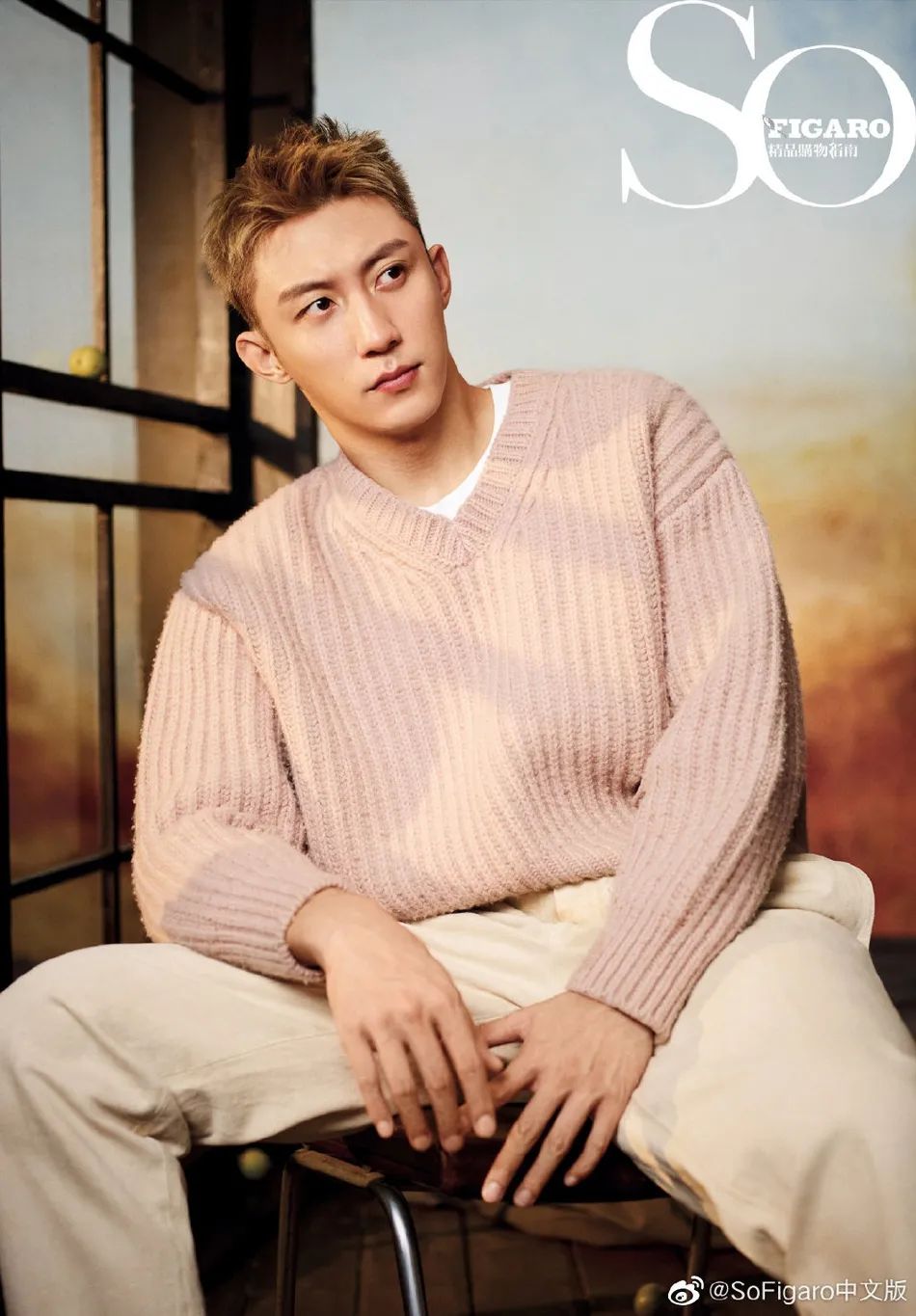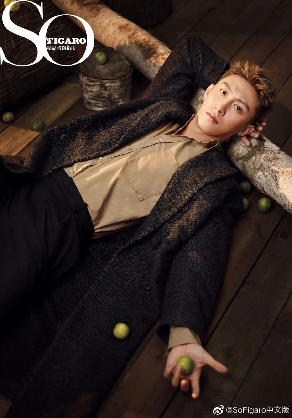 黄景瑜穿着西装,搭配棕黄色衬衫,他手拿绿色橙子,帅气逼人。