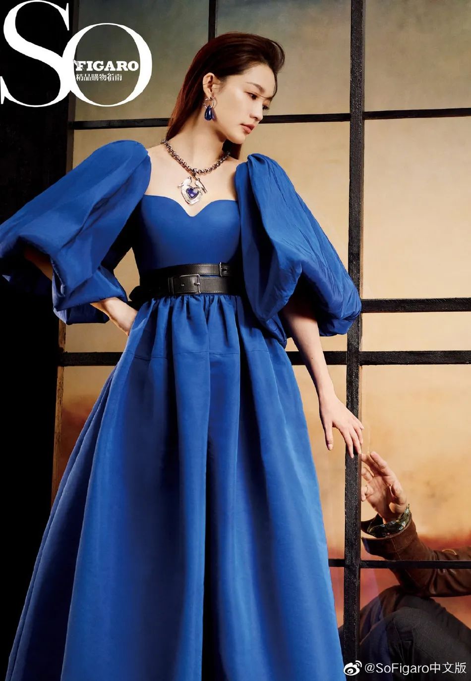 李沁穿着一袭蓝色深V长裙,她俏脸妩媚,单手叉腰,大秀自己的事业线与天鹅颈,她肌肤白皙如雪,身材曼妙多姿,美得让人心动。