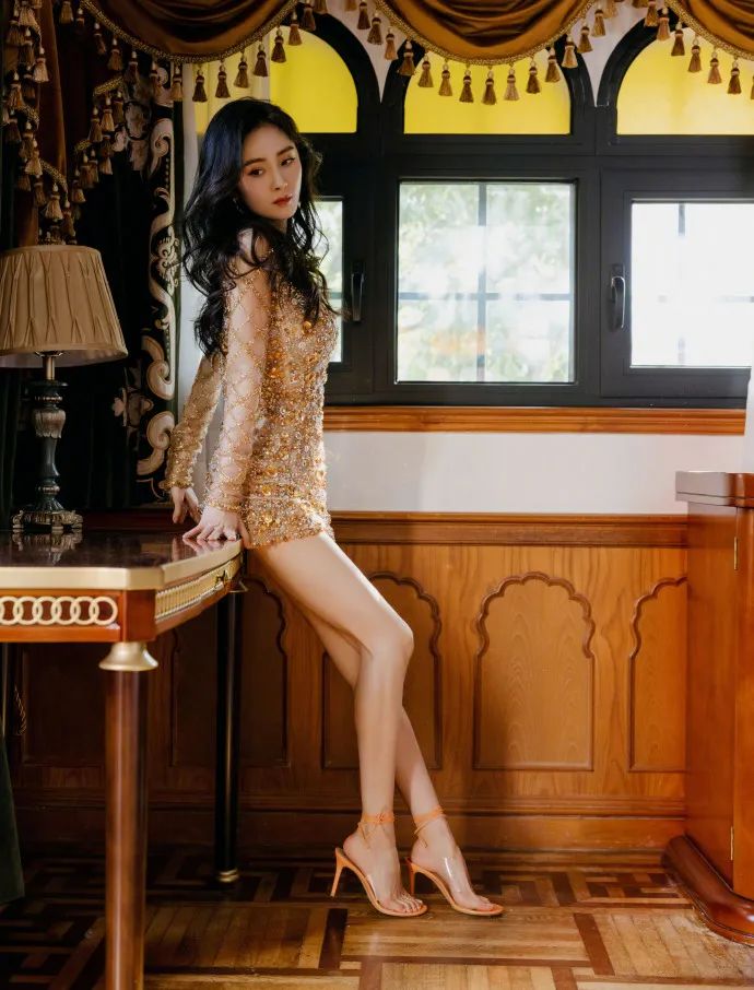 杨幂穿着镂空闪光短裙,她俏脸清丽,秀眸斜视,烈焰红唇,乌黑的长发飘逸,趴在座椅上很妩媚,大秀自己魔鬼身材,足够靓丽多姿。
