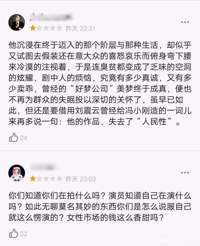 纵观全剧,女性成功全靠编剧的金手指,既不励志也不共情,更像是工业糖精,观众难以下咽。曾经贴近人民生活的喜剧导演冯小刚,则变成了偷懒卖货的老年版郭敬明,拍出自己的《小时代》,让人无语!