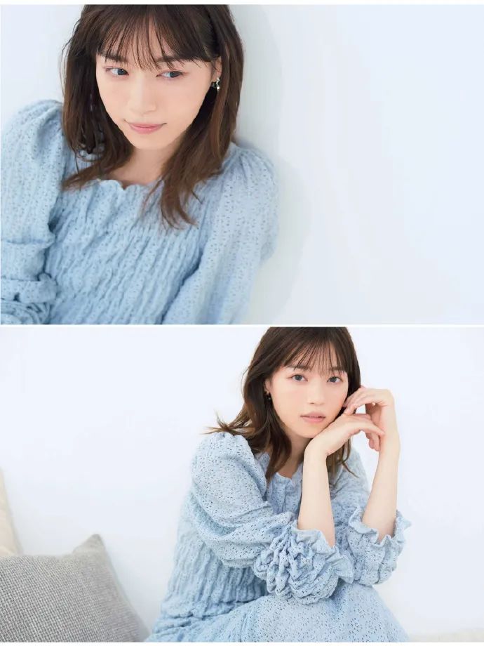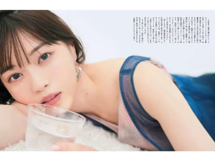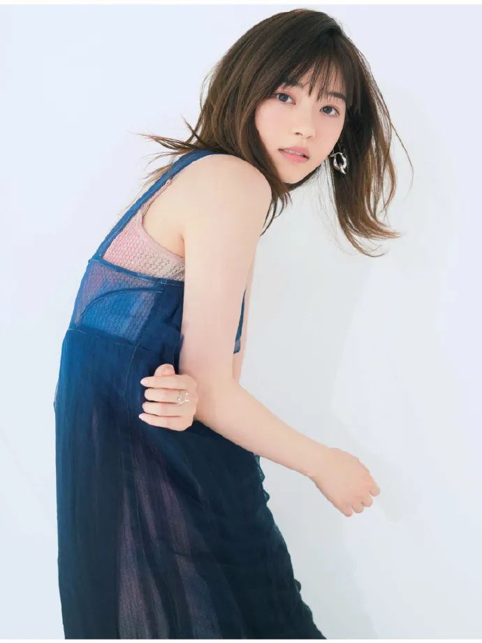 西野七濑穿一袭蓝色露肩透视纱裙,她五官精致,秀眸柔媚,趴在沙发上很妩媚,大秀白皙的香肩和天鹅颈,肌肤娇嫩如雪,这样的美女让人一看就移不开眼。