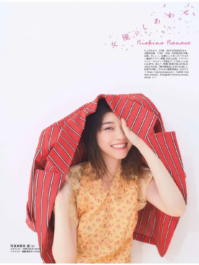 西野七濑,1994年5月25日出生于日本大阪府,日本歌手、演员、模特,日本女子偶像组合乃木坂46原成员。2011年8月21日,她正式加入乃木坂46。2012年2月22日,她随组合发行第一张单曲《窗帘围绕》,从而正式出道。