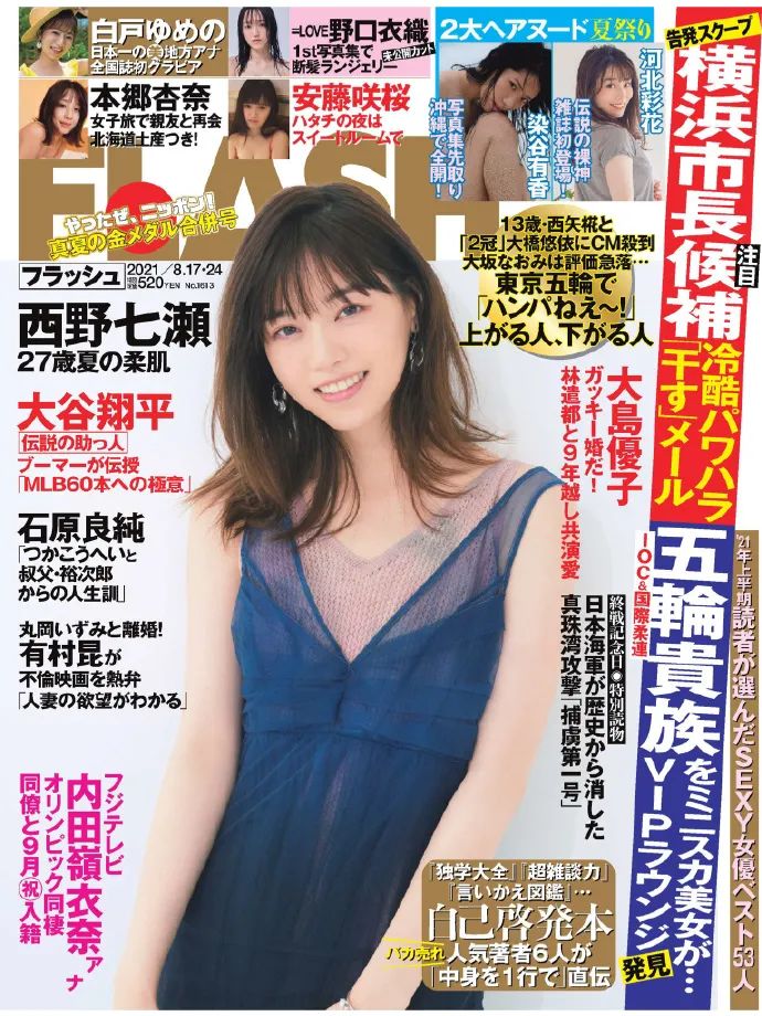 日本女星西野七濑登杂志封面,展现都市轻熟女性魅力。她穿一袭蓝色露肩透视纱裙,五官精致,秀眸妩媚,染黄的秀发很飘逸,肌肤白皙如雪,很有成熟美女的韵味。