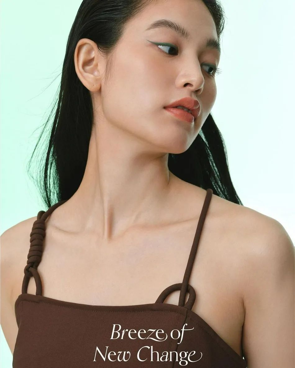 立花惠理穿着一袭棕色吊带长裙,她俏脸清纯可人,秀眸若有所思,朱唇红润,乌黑的秀发飘逸,大秀香肩和锁骨,肌肤白皙如雪,美得让人心动。