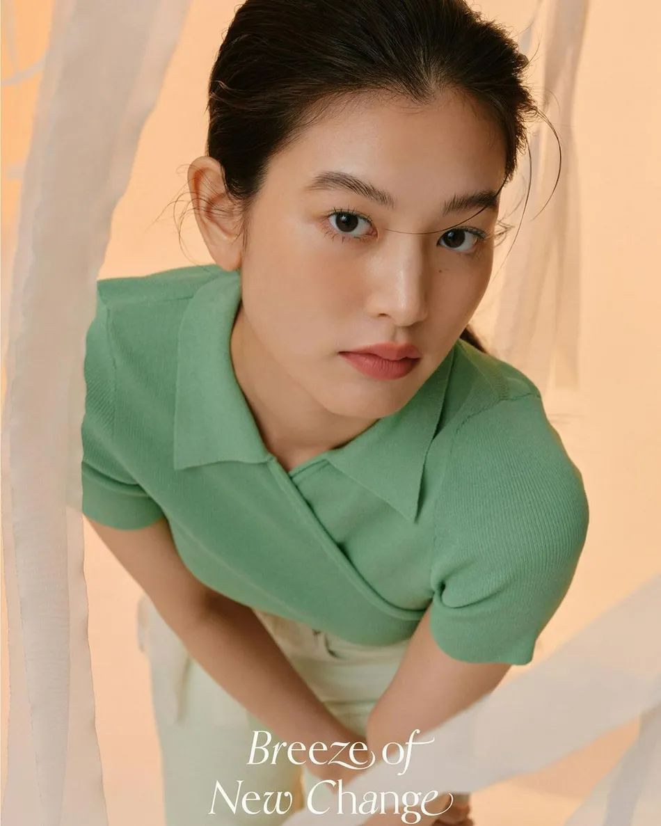 立花惠理穿着一袭绿色衬衫,搭配米色裤子,她俏丽可人,秀眸清澈如水,乌黑的秀发飘逸,她俯下身子对着镜头,还是很靓丽多姿的。
