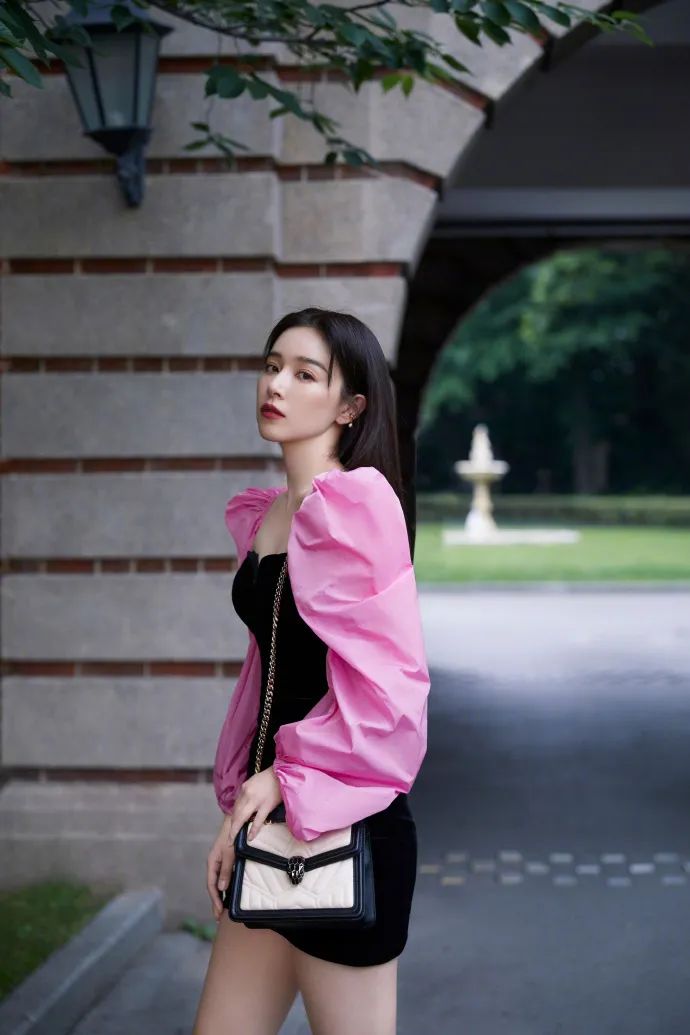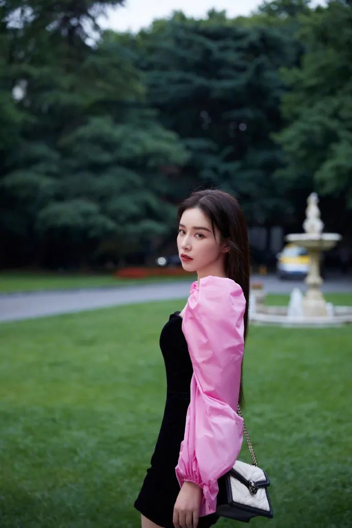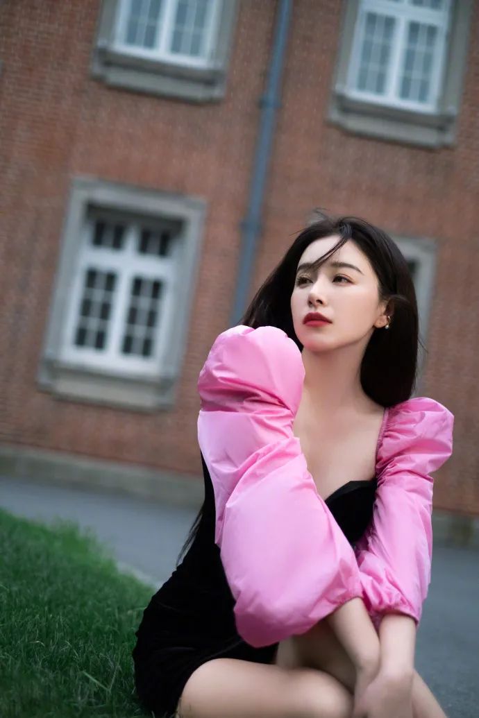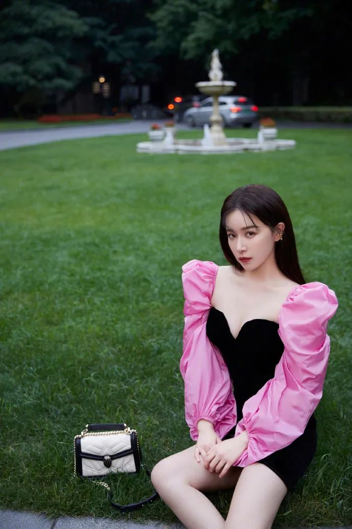 阚清子穿着一袭黑色深V短裙,披着粉色外套,这位美女直接坐在草地上,大秀事业线和大美腿,还是很性感美艳的。