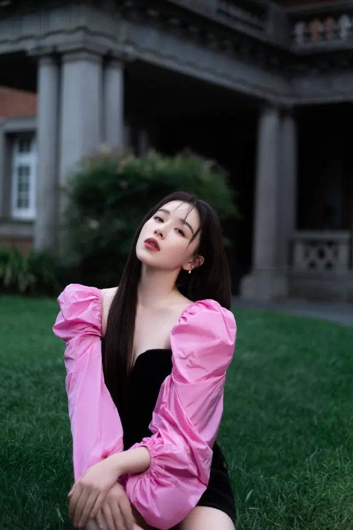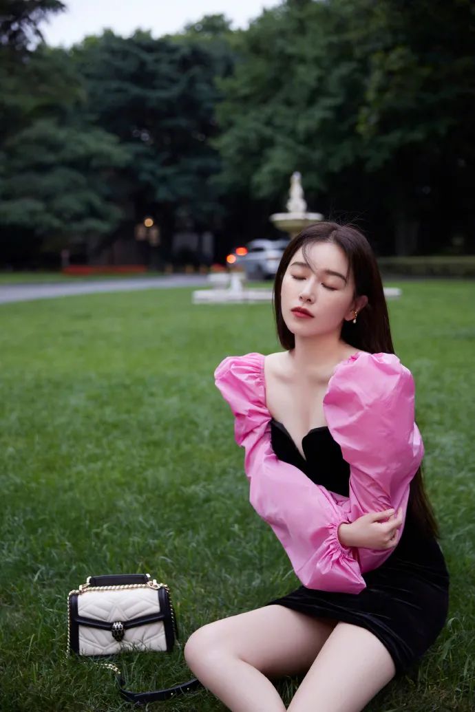 阚清子穿着一袭黑色深V短裙,披着粉色外套,她俏脸妩媚,五官精致,坐在草地上,一双白皙的大美腿很是性感撩人。
