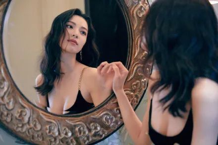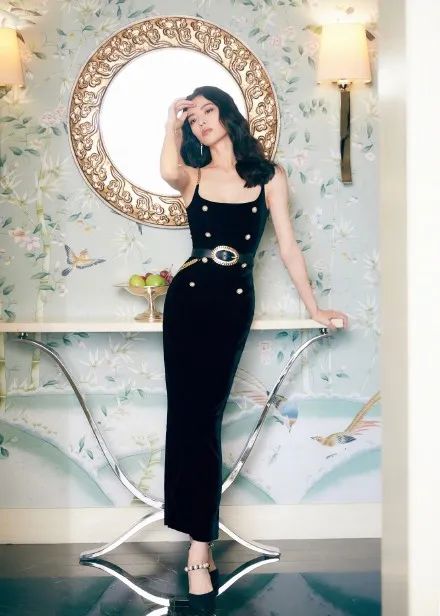 钟楚曦这张对镜美图堪称经典,她穿着一袭黑色抹胸吊带长裙,面容妩媚,秀眸灵动,朱唇红润,乌黑的卷发飘逸如瀑布,大秀自己傲人的事业线,还是很性感撩人的。