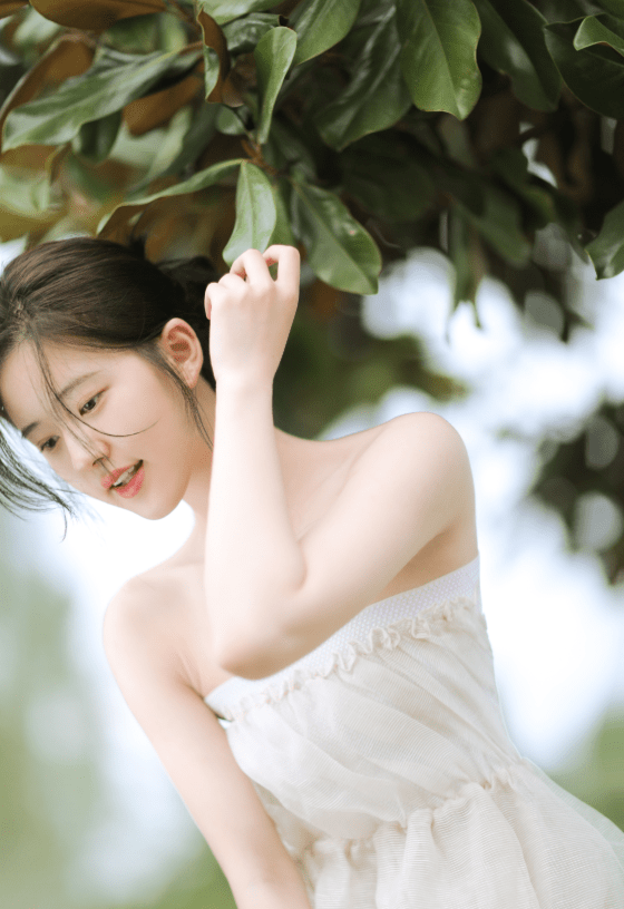 赵露思身穿白色抹胸连衣裙,头顶绿叶很靓丽多姿,她俏脸清丽脱俗,秀眸灵动,唇红齿白,几缕秀发飘逸在脸颊边,魅力十足。赵露思还大秀自己白皙的香肩和事业线,肌肤娇嫩如雪,太性感明艳了!