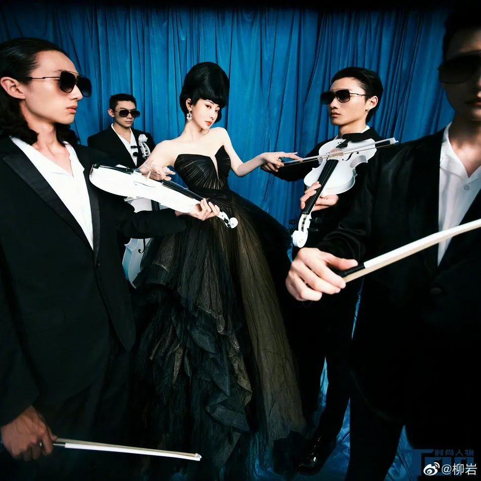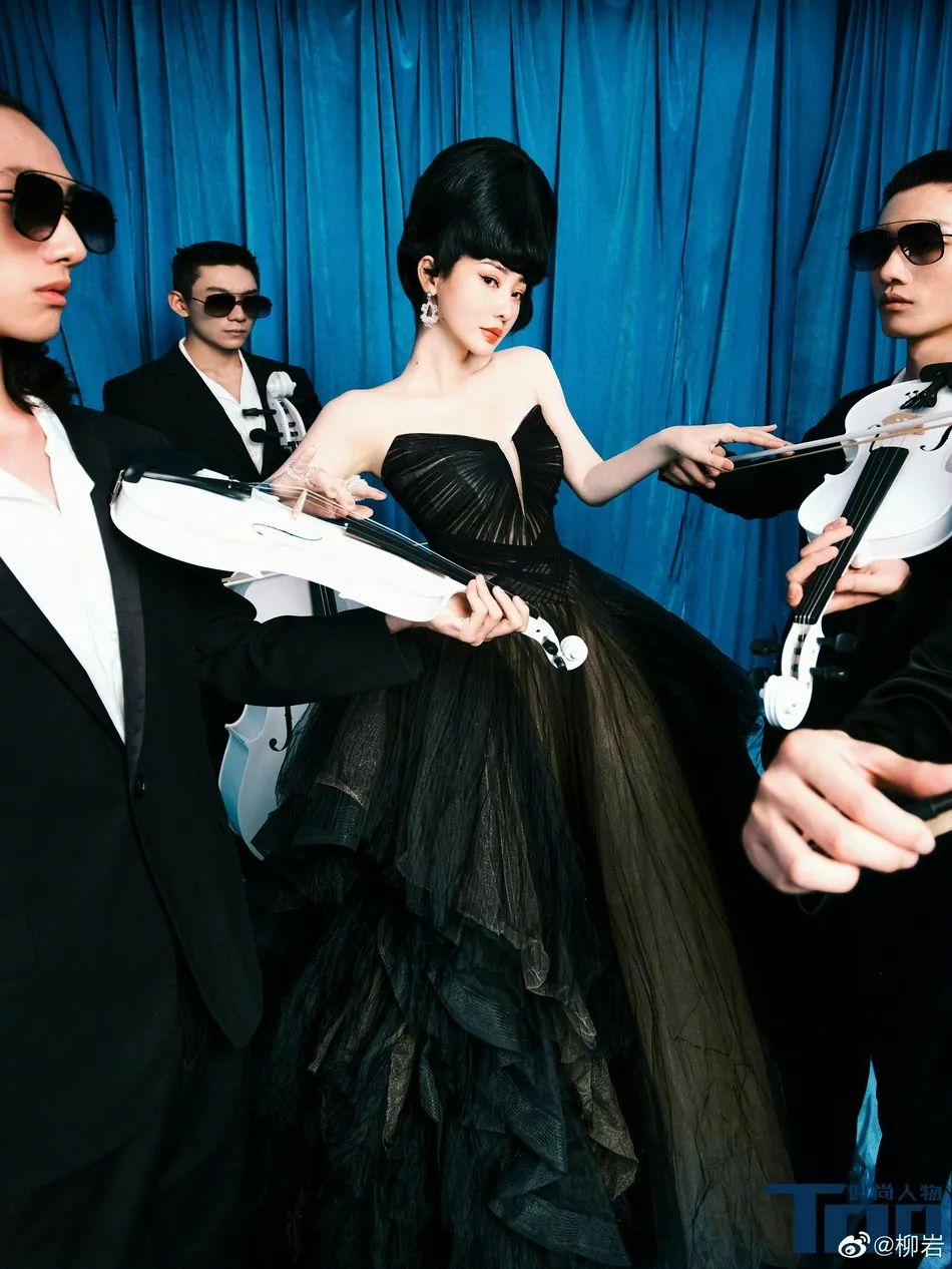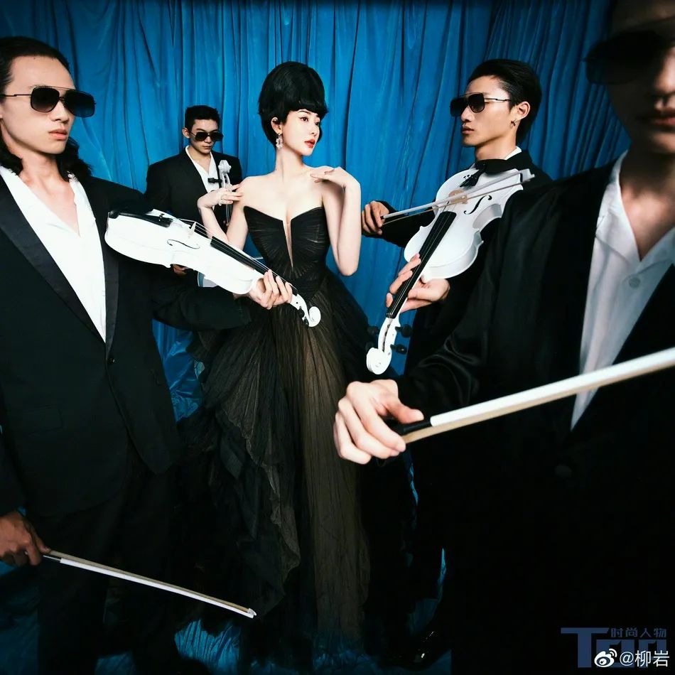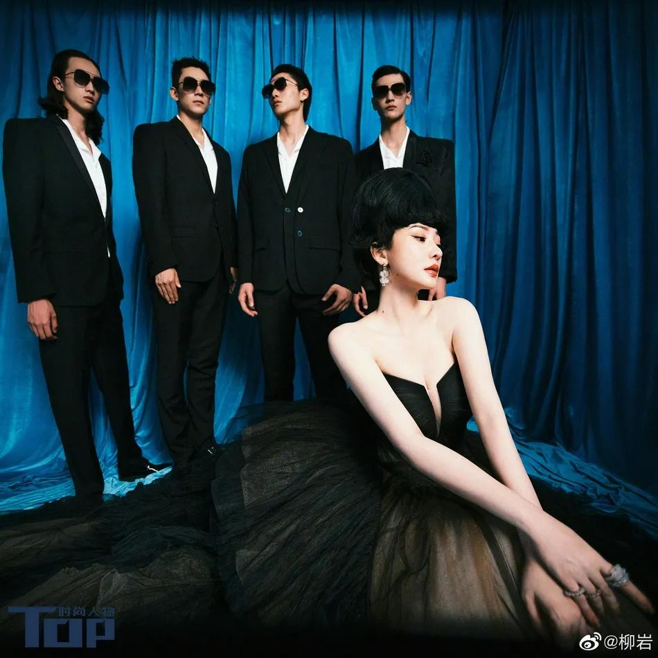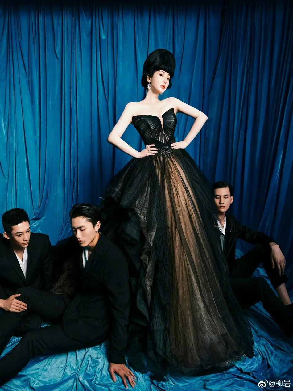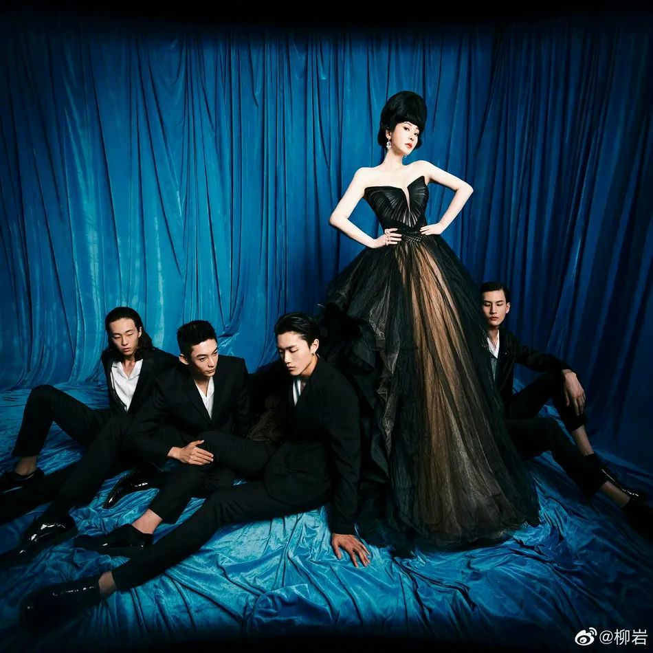柳岩身穿一袭黑色抹胸长裙,她俏脸靓丽妩媚,秀眸灵动,烈焰红唇,双手叉腰,大秀自己的香肩和事业线,下面坐着四位男模特作为衬托,让柳岩显得更加性感撩人。