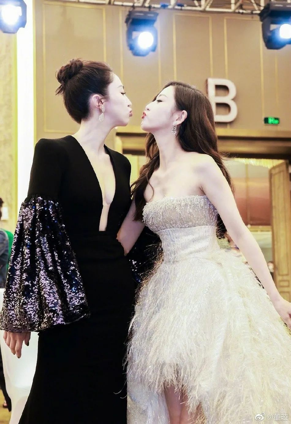 董璇和佟丽娅做出一个隔空亲嘴的姿势,两大美女争奇斗艳还是很性感迷人的。