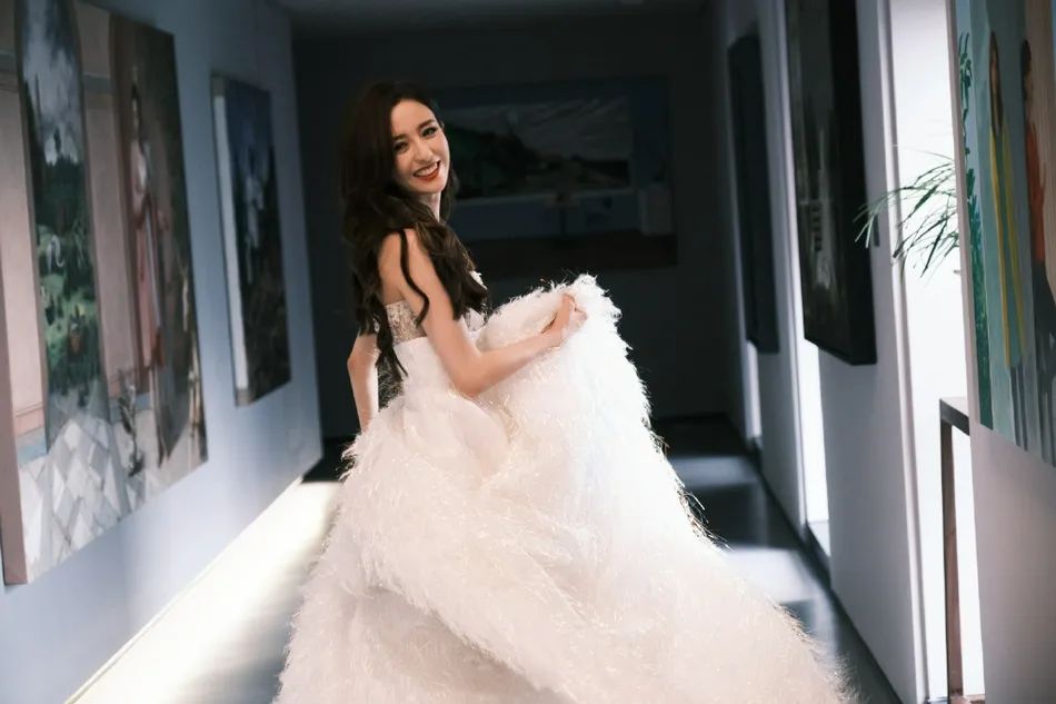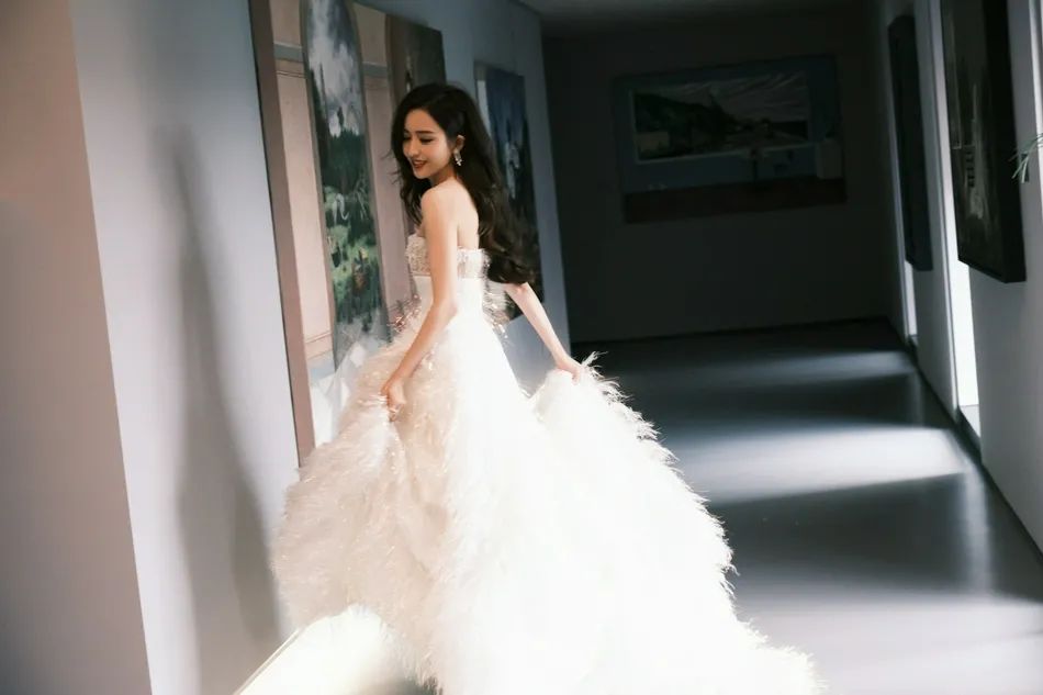 佟丽娅当日身穿被色羽毛裙,还是很靓丽多姿的。