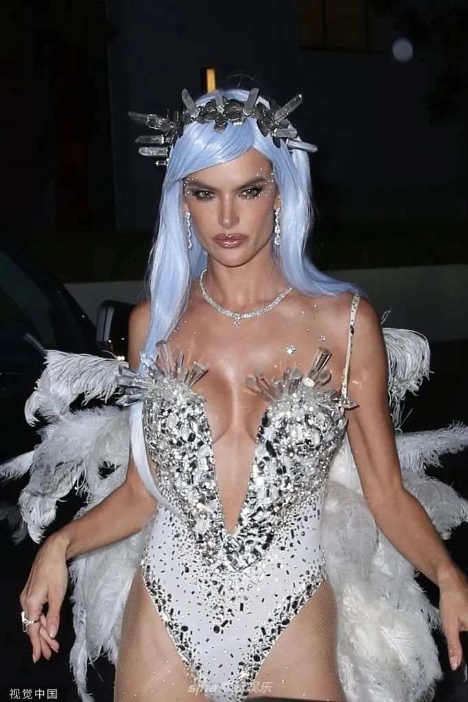当地时间2021年10月30日,亚历山大·安布罗休(Alessandra Ambrosio)到达CARN*EVIL万圣节派对,白色羽毛造型化身性感女神。这位超模俏脸成熟妩媚,大秀自己的香肩和事业线,一双白皙的大美腿在白色透视丝袜下,更显得性感撩人。