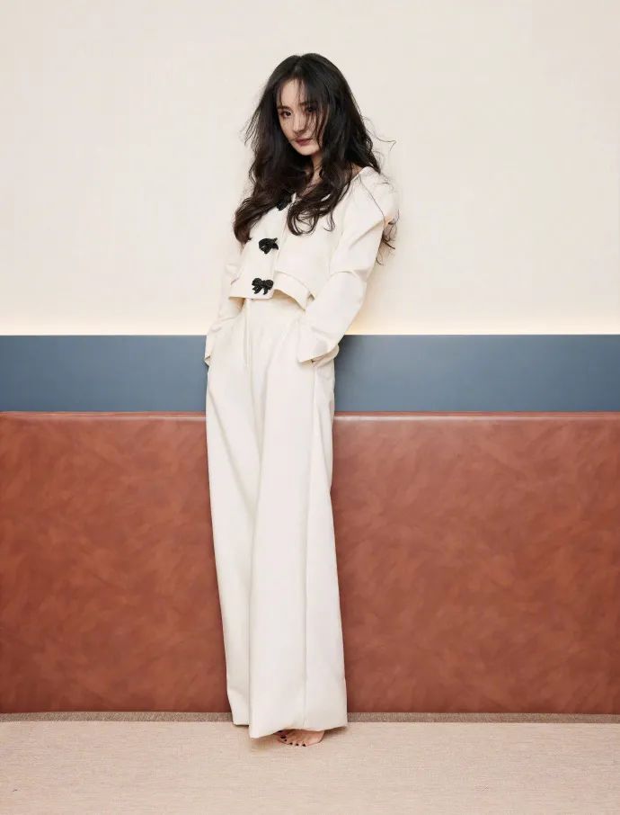 杨幂穿着一袭白色衣裤,她俏脸成熟妩媚,秀眸明亮,烈焰红唇,乌黑的秀发飘逸,她盘着腿坐在椅子上,绝对清丽脱俗。