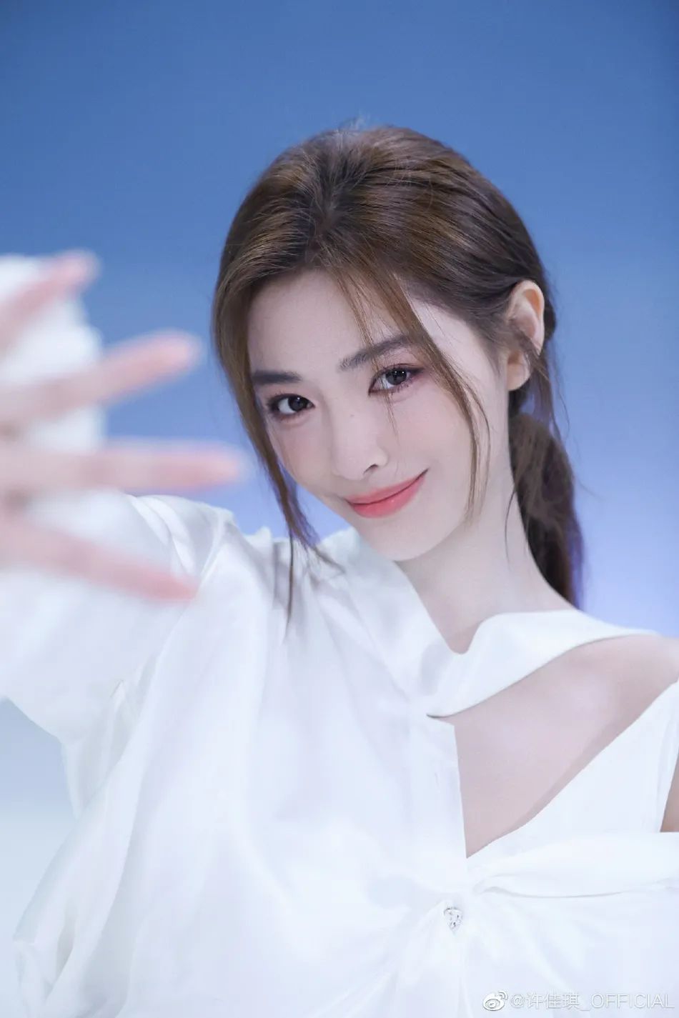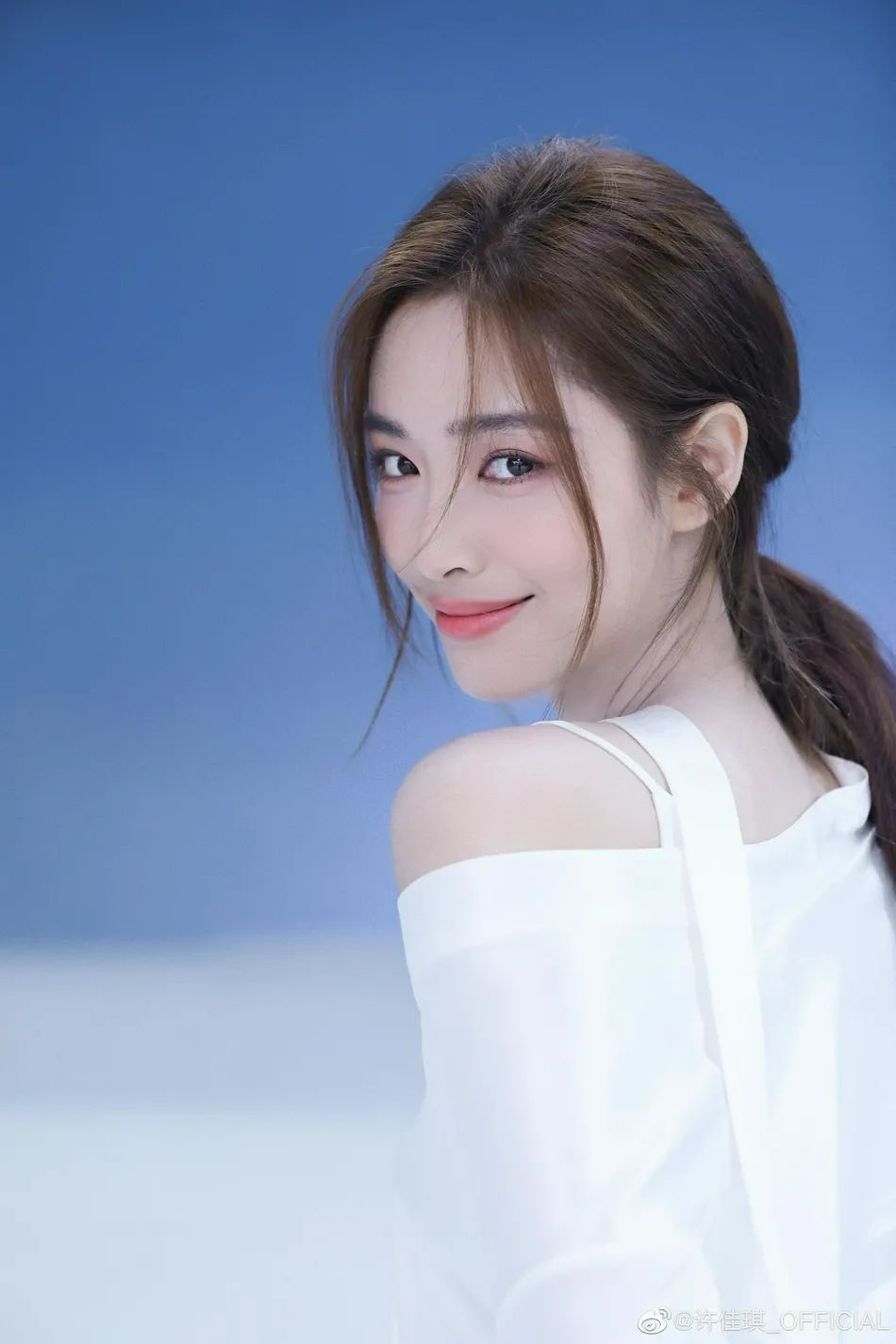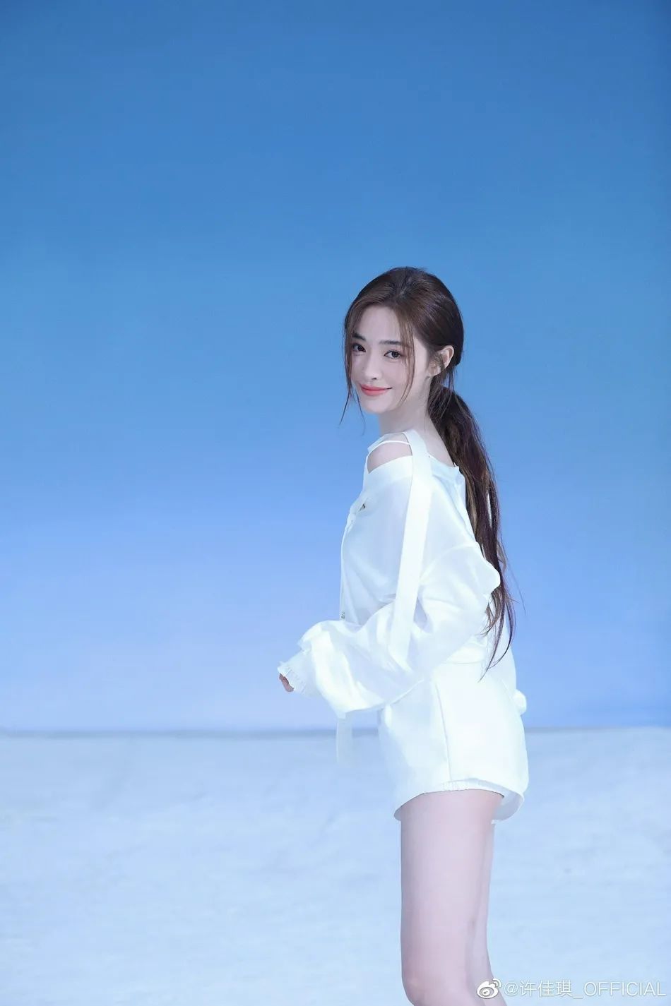 许佳琪身穿一袭白纱长裙,俏脸精致,秀眸明亮,烈焰红唇,微微染黄的秀发梳成马尾巴,她露出白皙的香肩,回眸浅笑糖分满满。