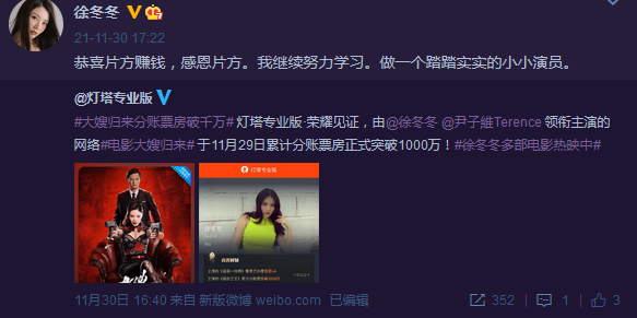 但是,最近徐冬冬转发了灯塔专业版的微博,她谦虚称:“恭喜片方赚钱,感恩片方。我继续努力学习。做一个踏踏实实的小小演员。”足见徐冬冬这位女演员没有忘记初心,还是勤勤恳恳去担当一名打工仔的角色,让人敬佩!