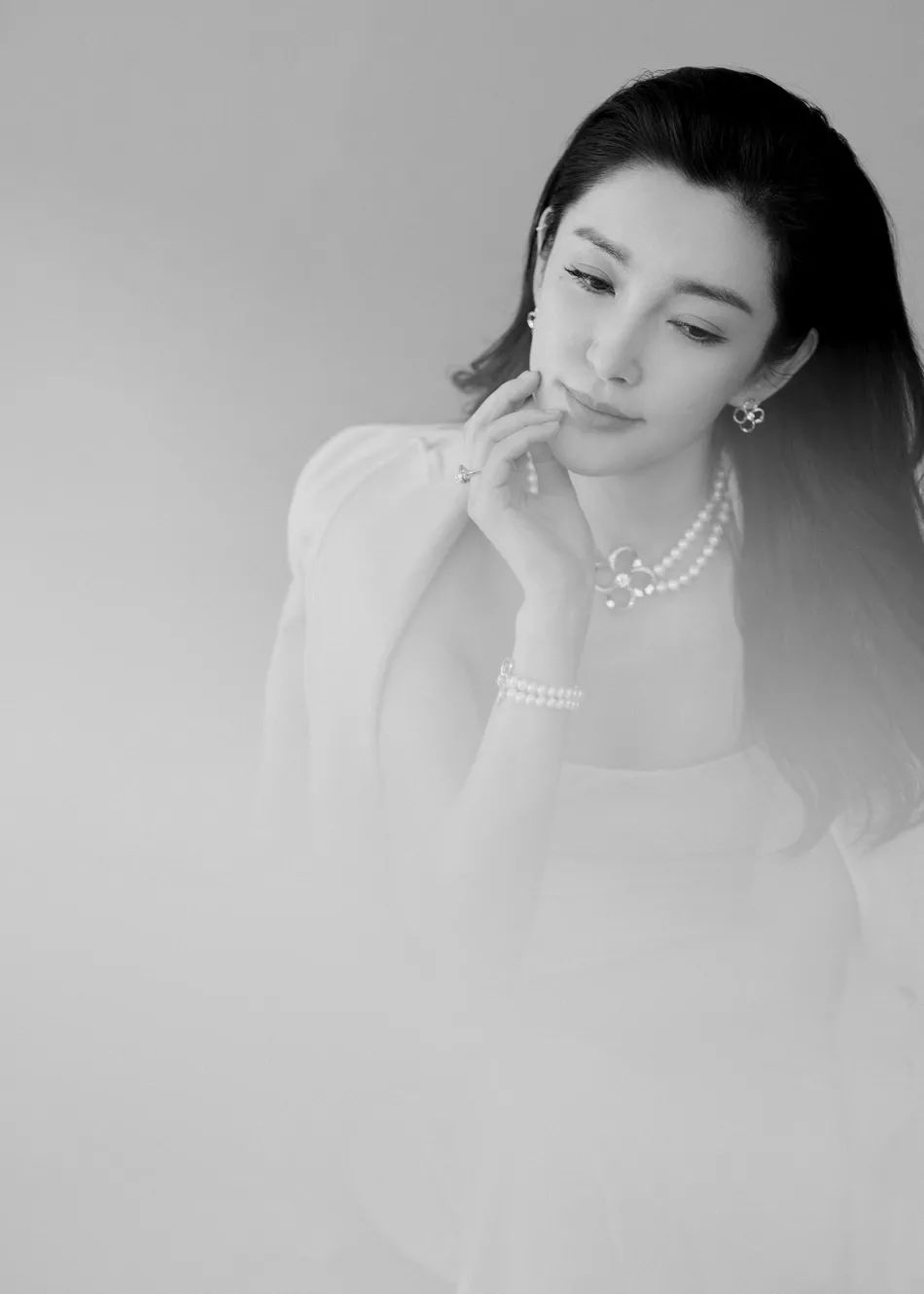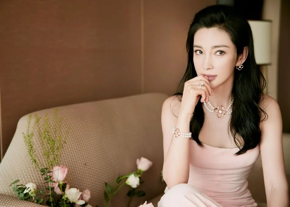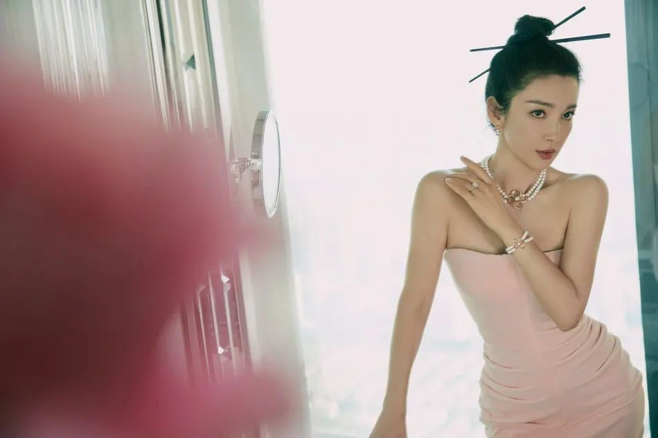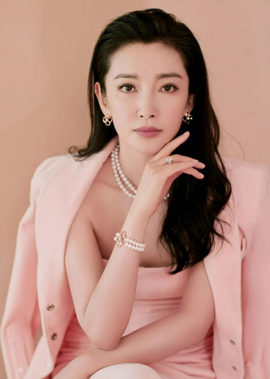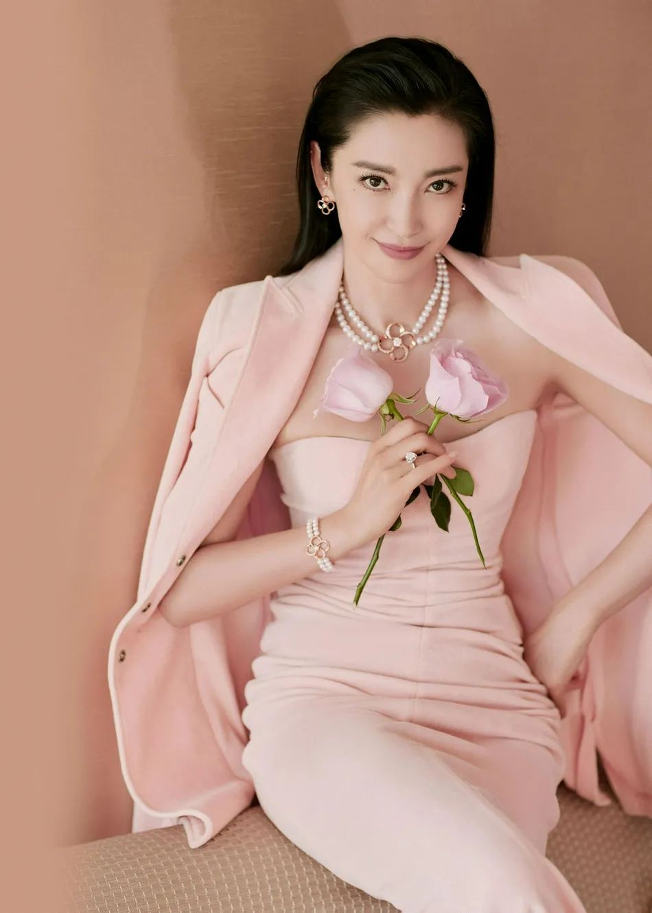 当红美女明星李冰冰身着一袭粉色抹胸裙,搭配粉色西装,她俏脸清纯冷艳,秀眸明亮,朱唇红润,手臂戴着大珍珠链子,大秀自己白皙的天鹅颈,肌肤白皙如雪,美得不可方物。