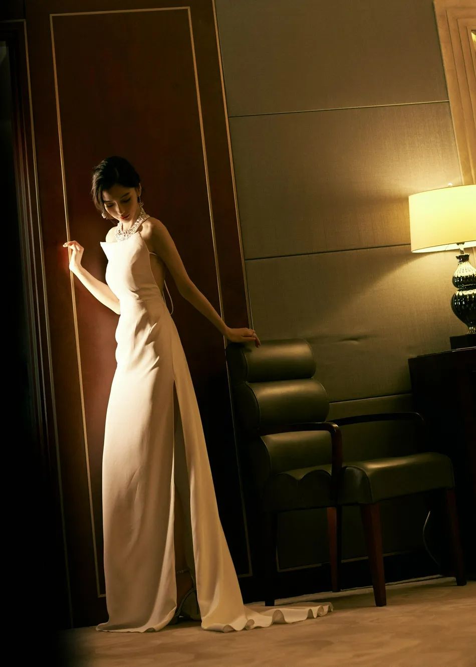 angelababy穿着一袭纯白露背长裙,她侧身站立亭亭玉立,回眸凝视百媚生,妩媚的大眼睛很明亮,白皙的肌肤很娇嫩,绝对性感撩人。