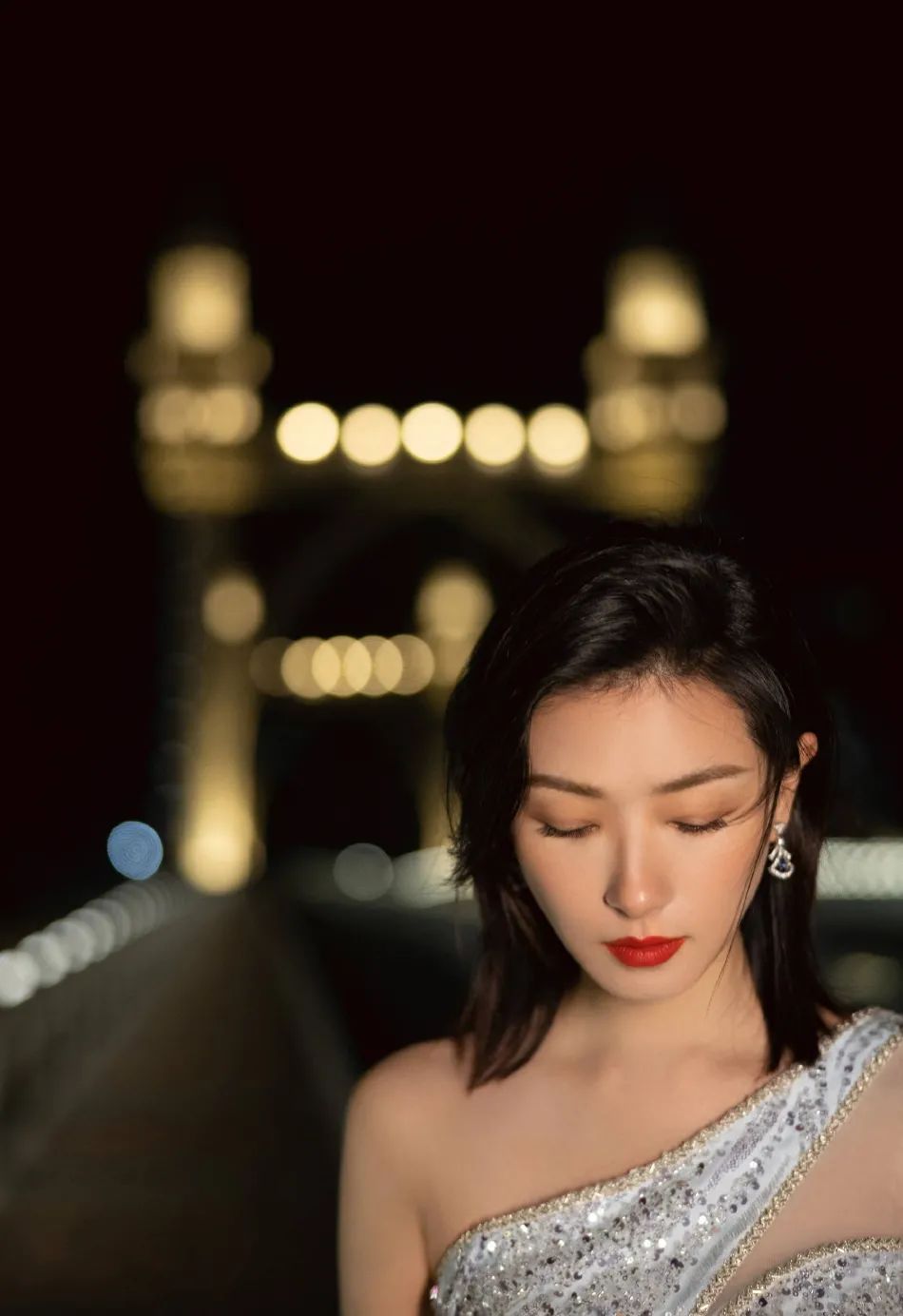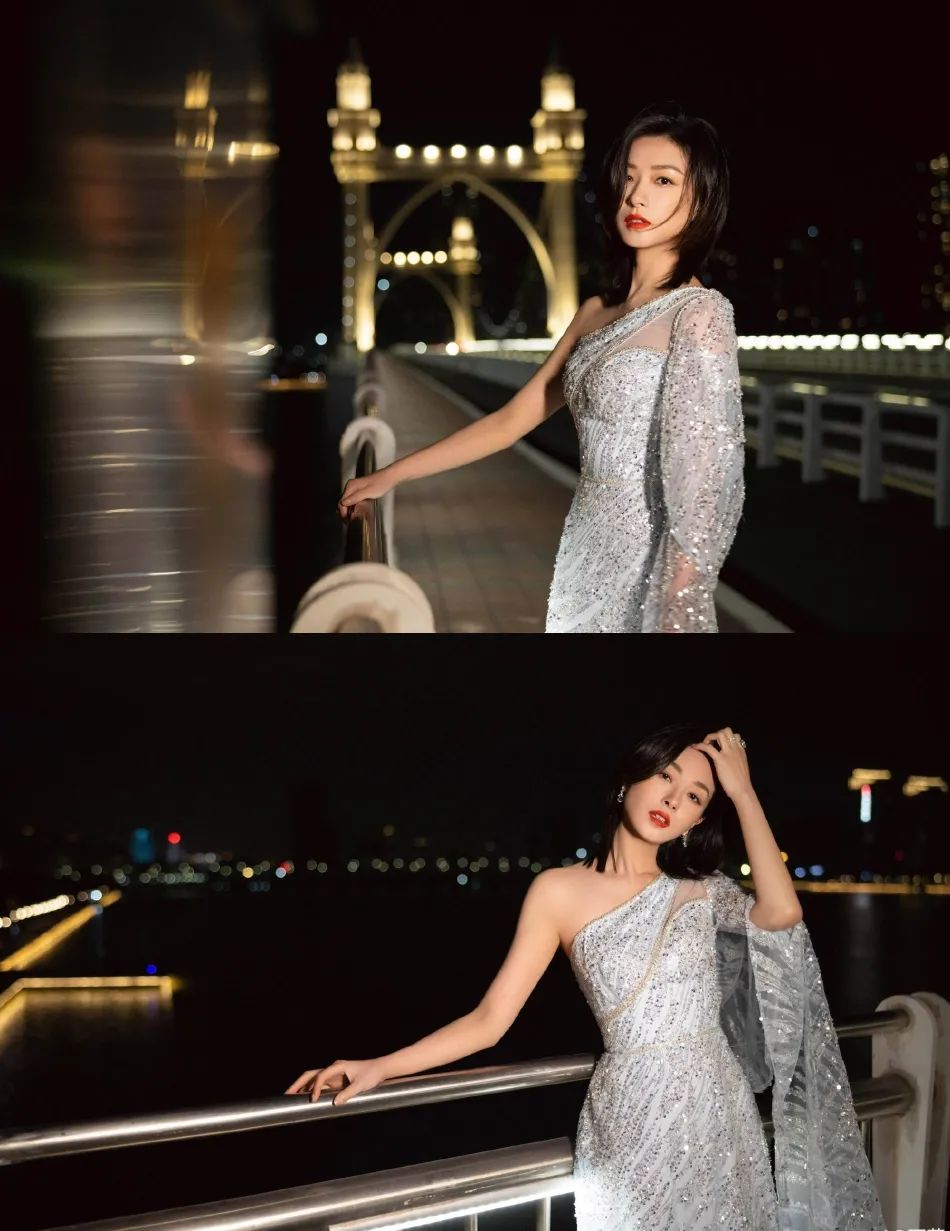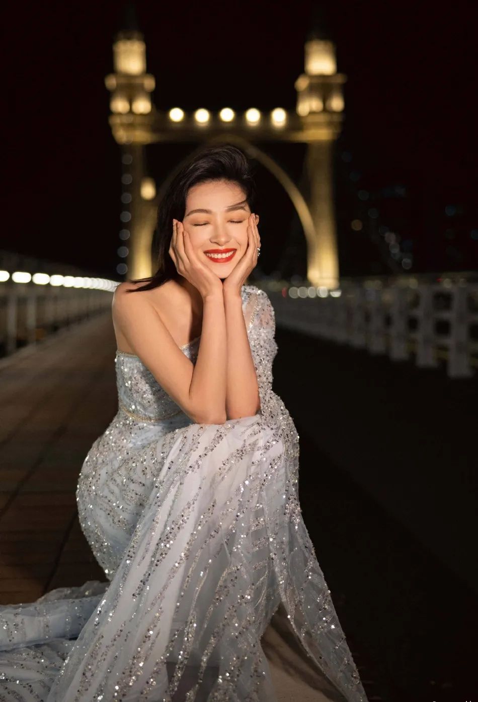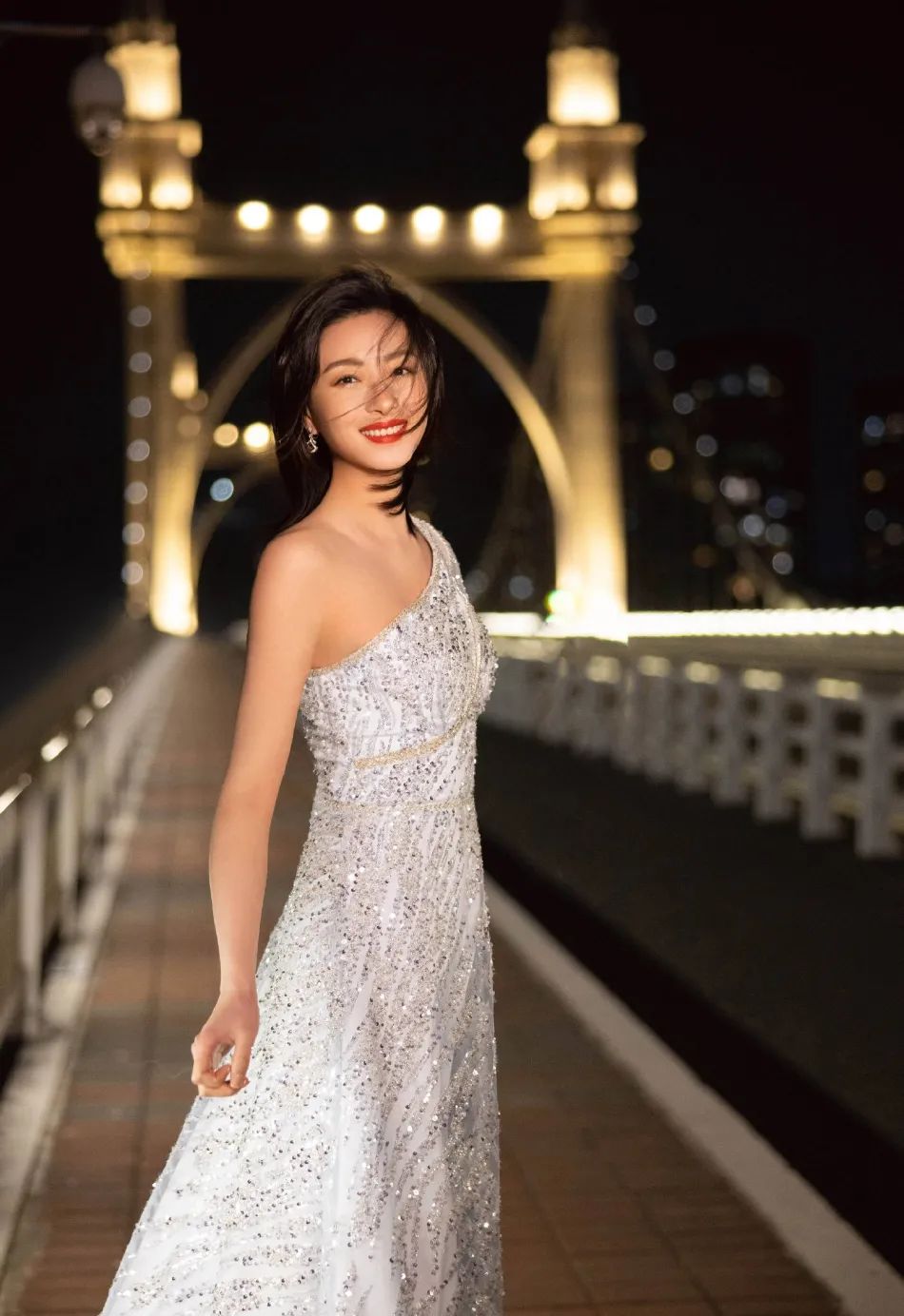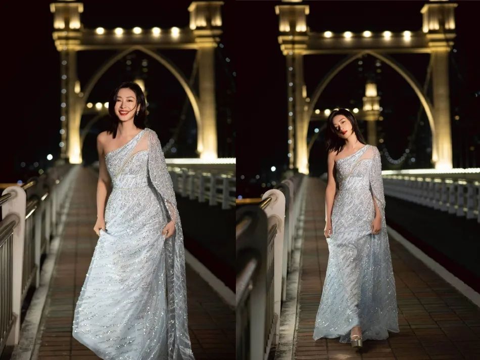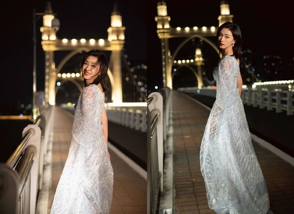 万茜身穿银色斜肩礼服裙,站在大桥上很甜美可人,她双手托着俏脸,微微一笑很倾城,魅力不可小觑。