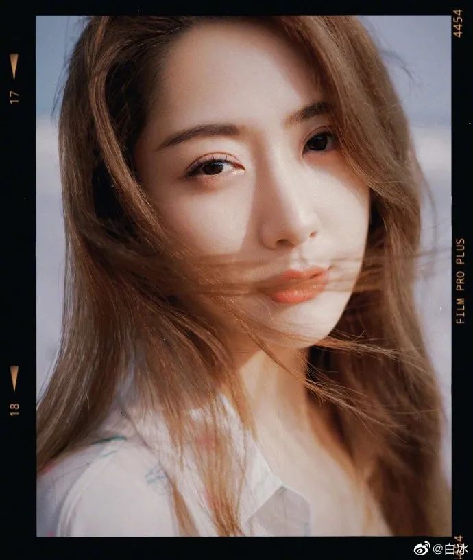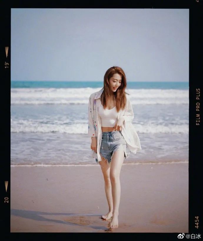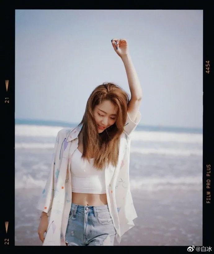白冰穿着一袭白色斑点的衬衫,里面是白色小背心和蓝色牛仔裤,她俏脸清丽,秀眸明亮,唇红齿白,染黄的秀发随风飘逸,魅力十足。她站在海边上,大秀自己的小肚脐,微微一笑很倾城,美得让人心动。
