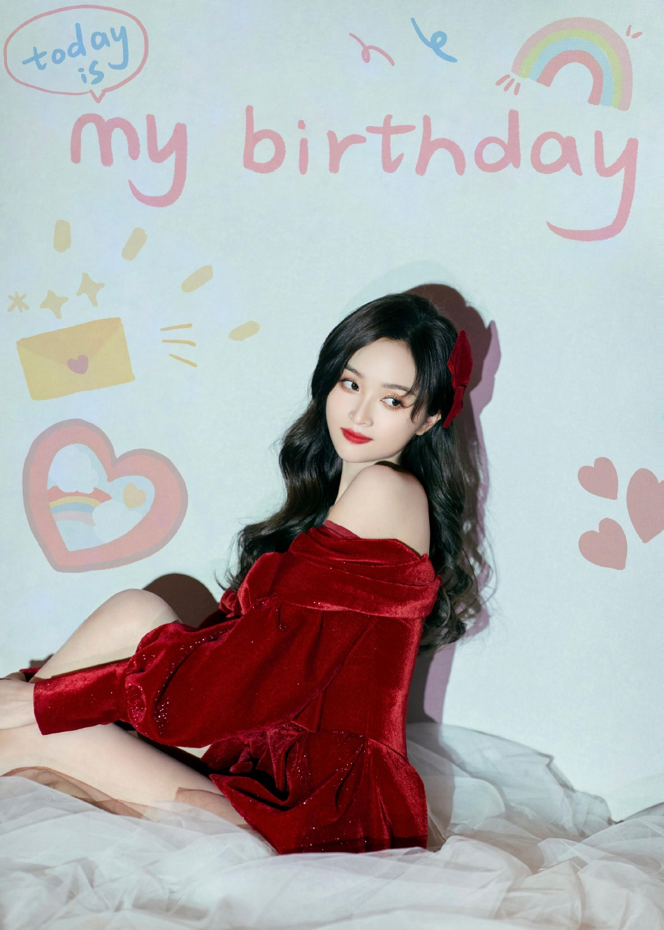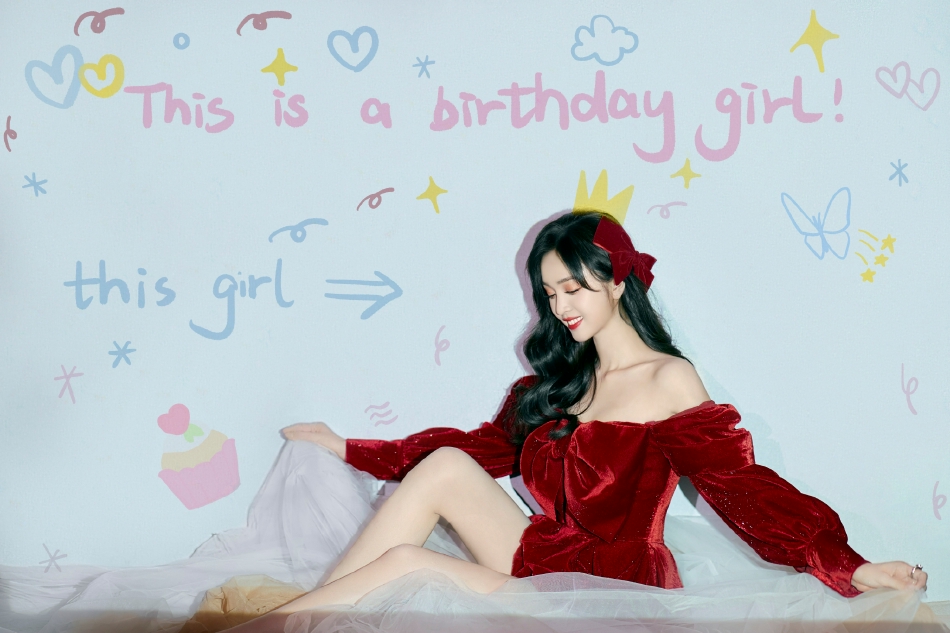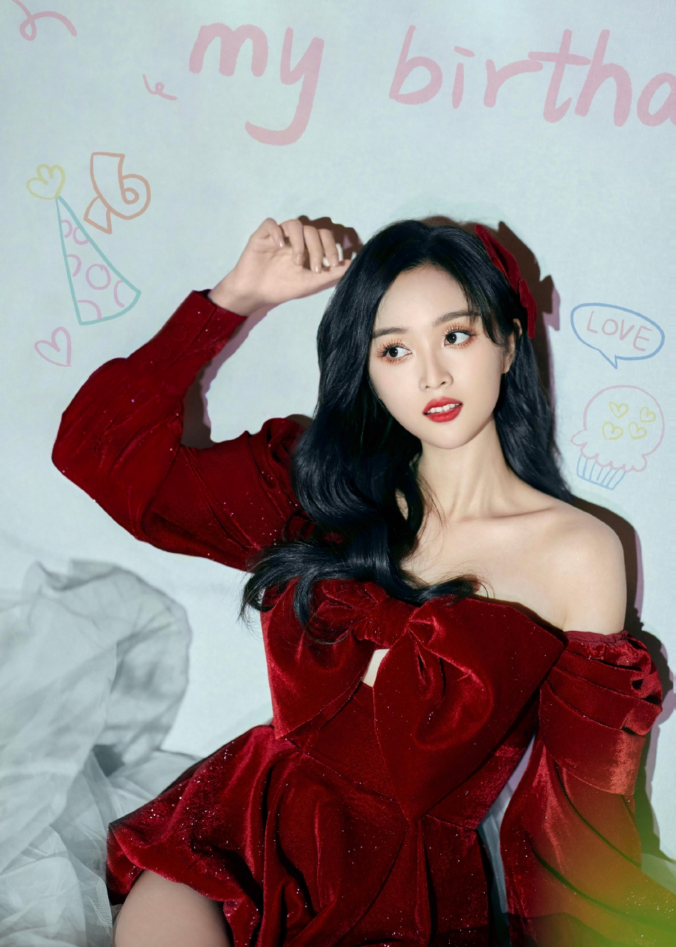 吴宣仪身穿红色丝绒一字肩短裙,头戴红色丝绒蝴蝶结,她坐在自己生日墙壁的边上,俏脸又纯又欲,露出白皙的大美腿,绝对性感火辣!
