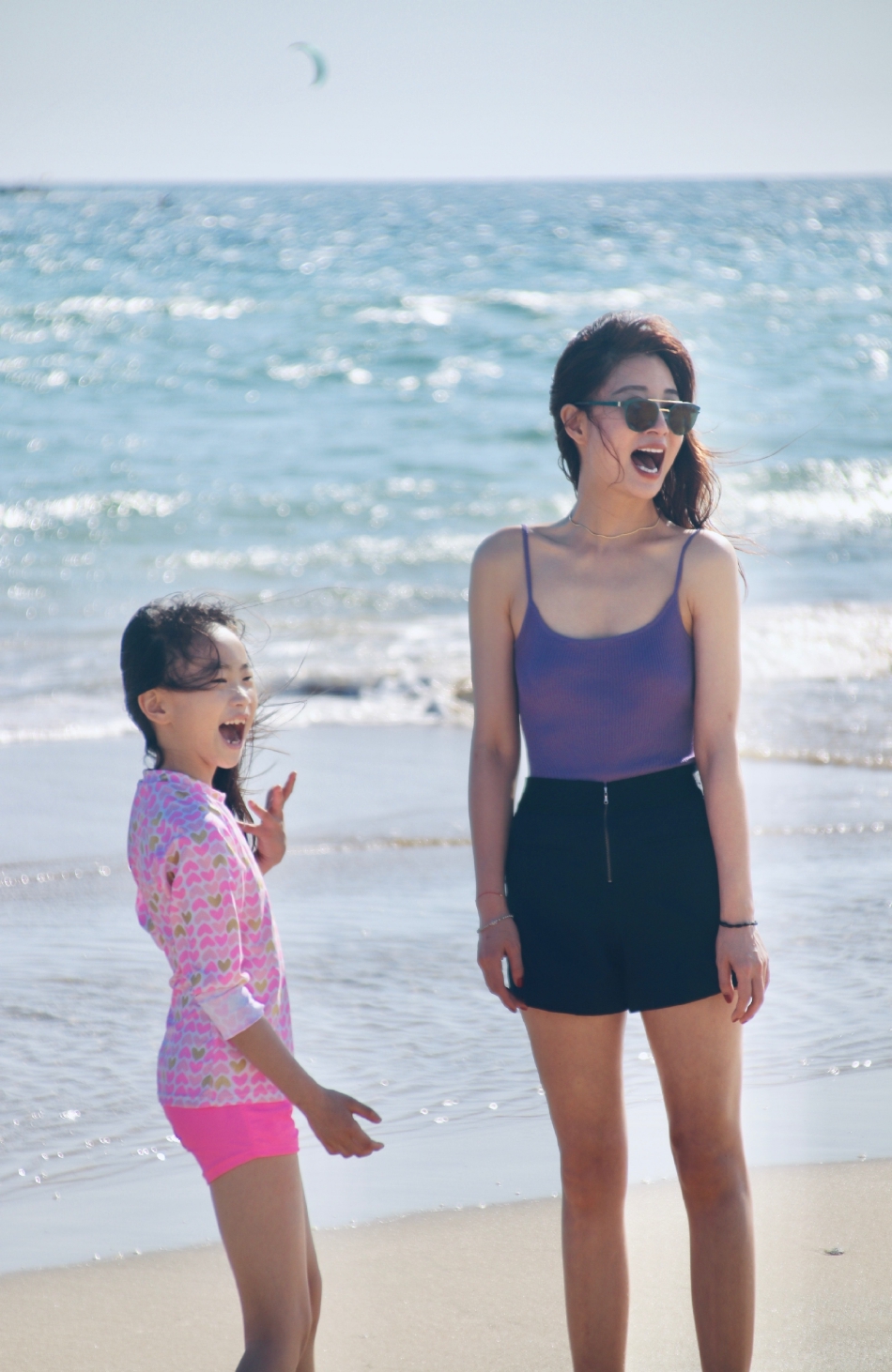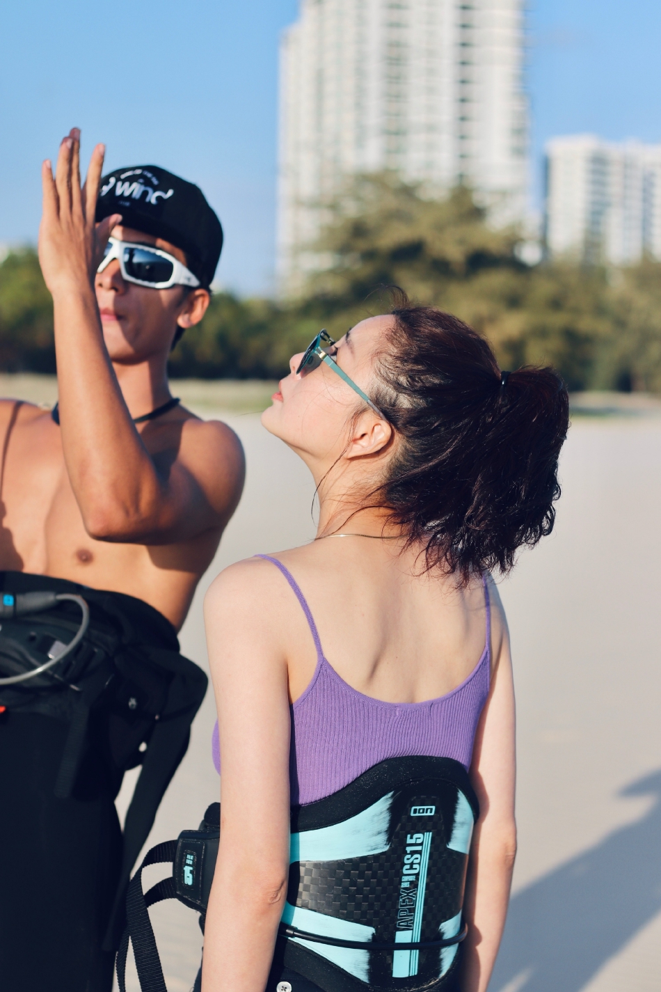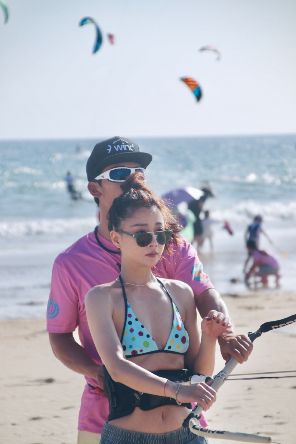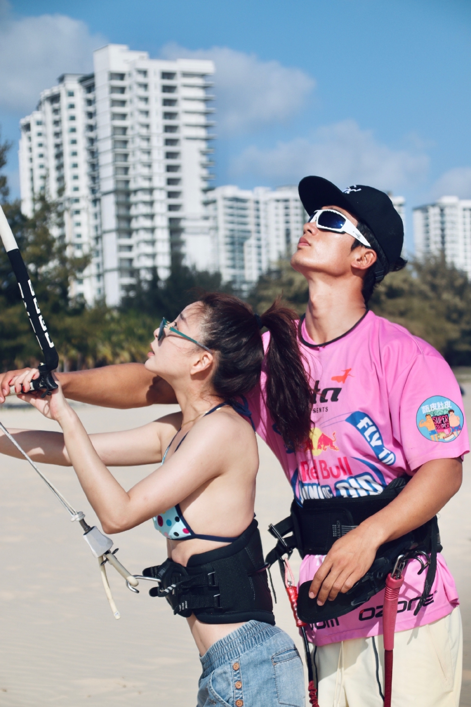 殷桃穿着紫色吊带小背心,腰间背着护具,她戴着墨镜,俏脸仰望天空,大秀白皙的香肩和后背,美得让人心动。