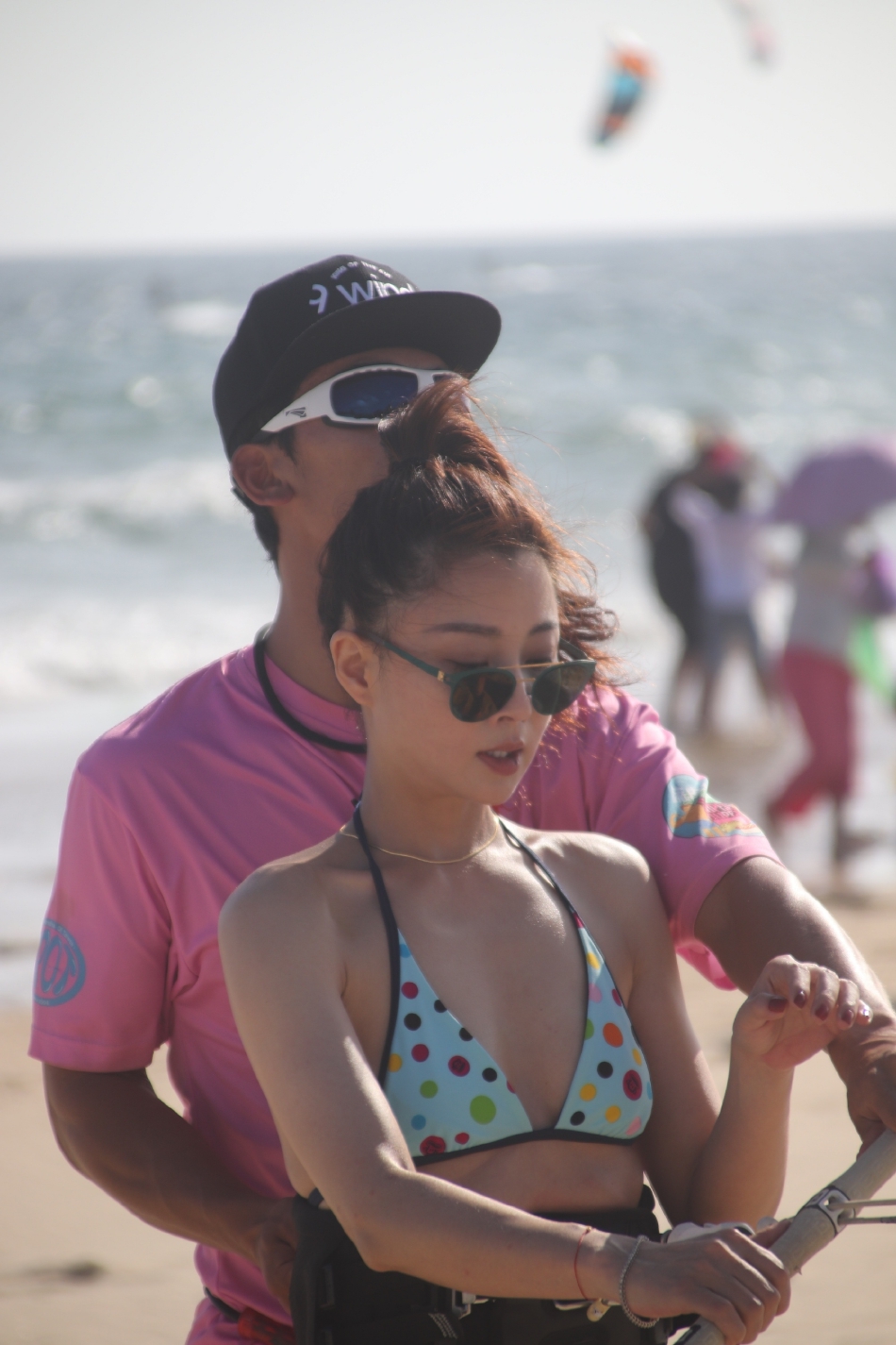 殷桃穿着蓝色花纹的比基尼泳装,在教练陪护下,准备去滑水,她大秀自己魔鬼身材,还是很性感火辣的。