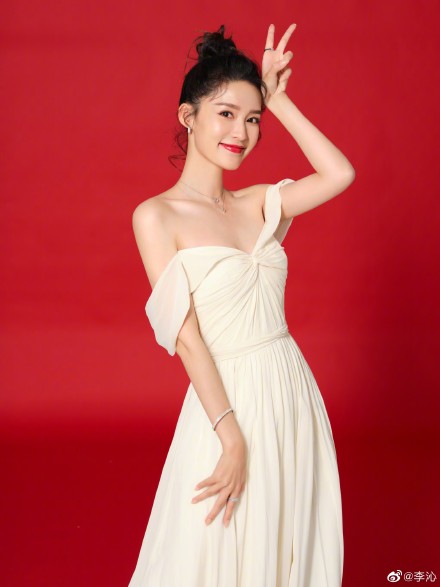李沁穿着一袭抹胸白色衣裙,她俏脸清丽脱俗,秀眸明媚如水,单手举过头顶比划着胜利的姿态,这样的女星肤白貌美,魅力不可小觑。
