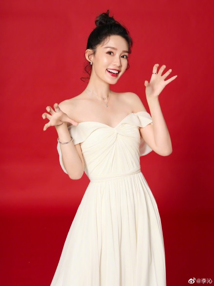 李沁穿着一袭抹胸白色衣裙,俏脸清丽,秀眸明亮,甜美微笑,唇红齿白,这位美女双手抱拳的样子很可人,美得让人心动。