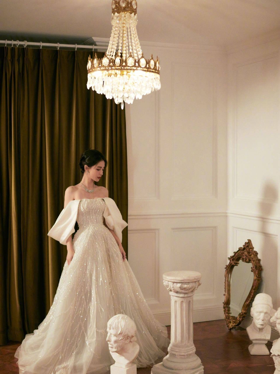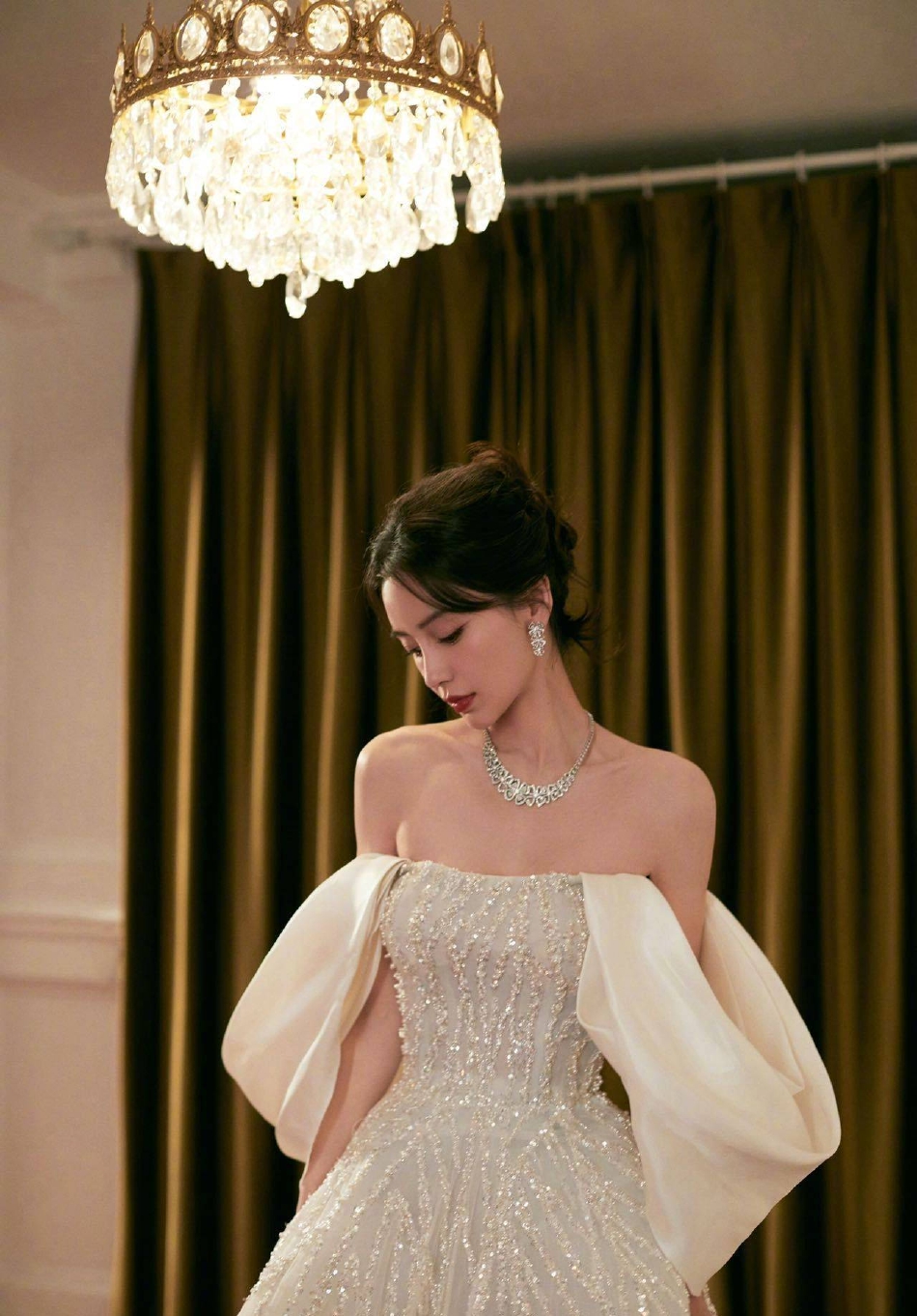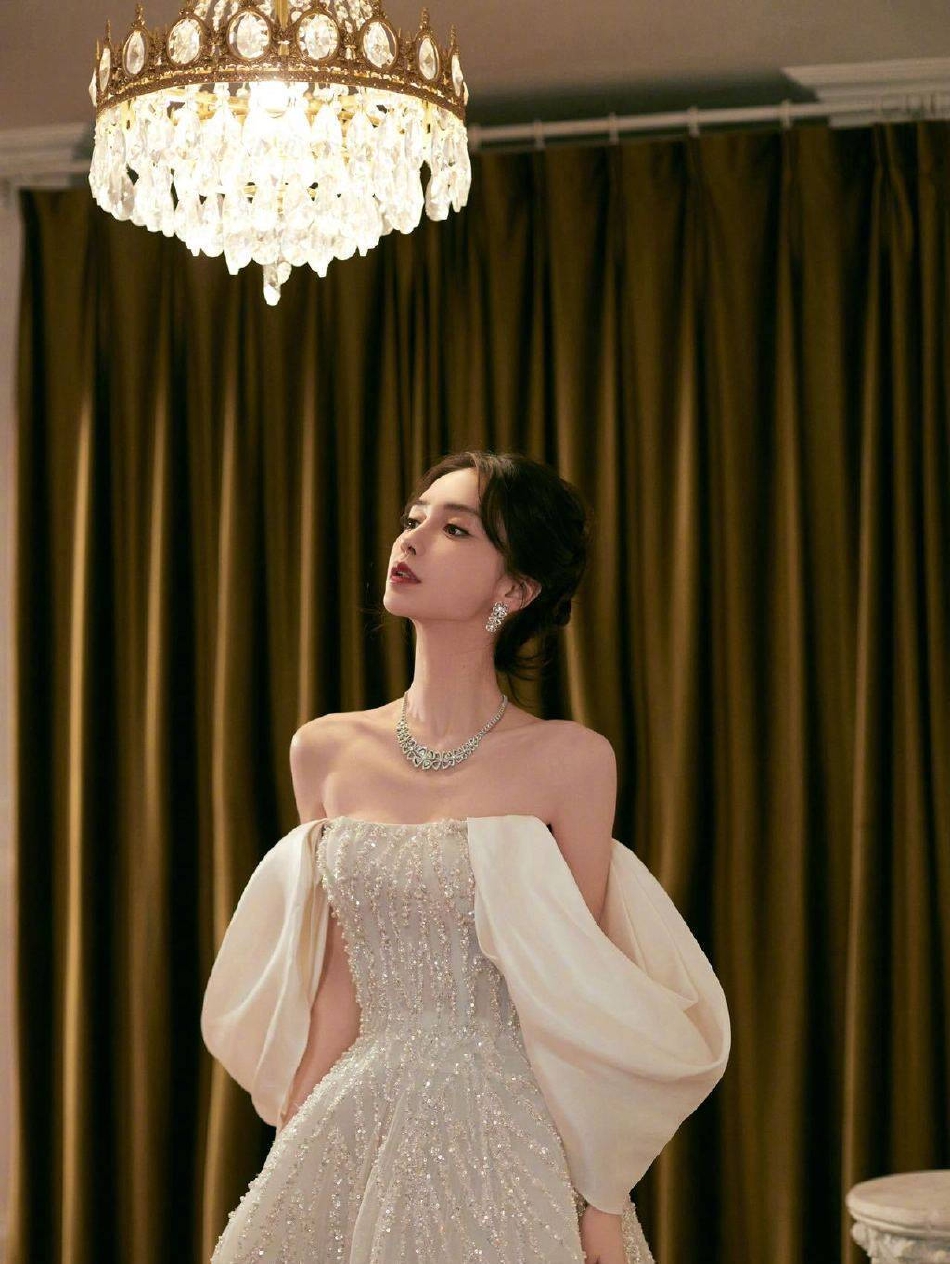 杨颖穿着白色抹胸衣裙,脖子戴着银色珠宝项链,她俏脸清丽,秀眸明亮,唇红齿白,大秀白皙的香肩,美得像一位小公主!