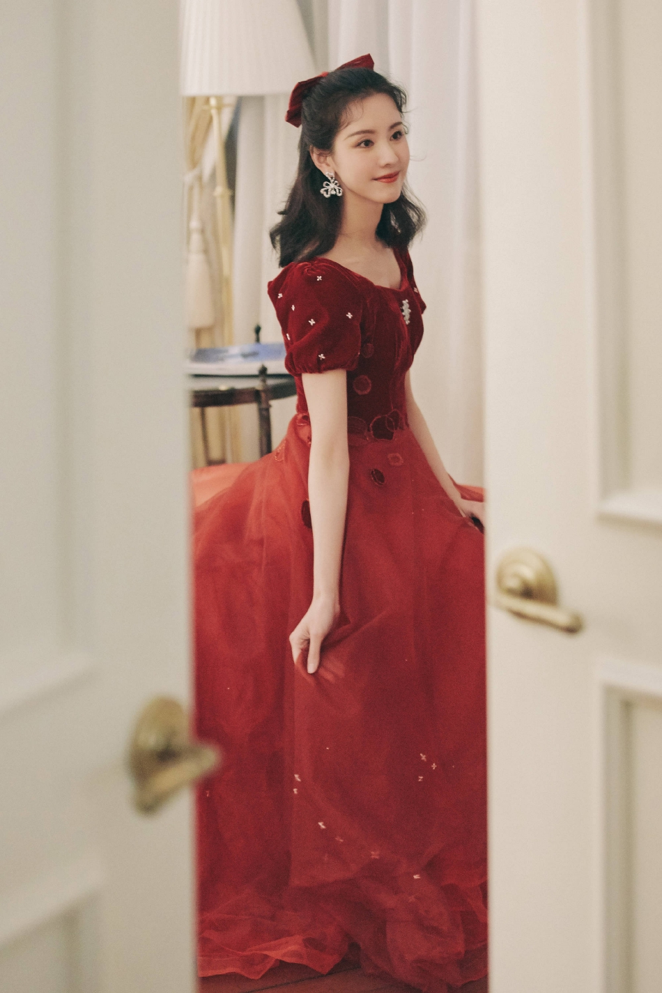 陈都灵穿着一袭红色长裙,她站在门口的样子,亭亭玉立。