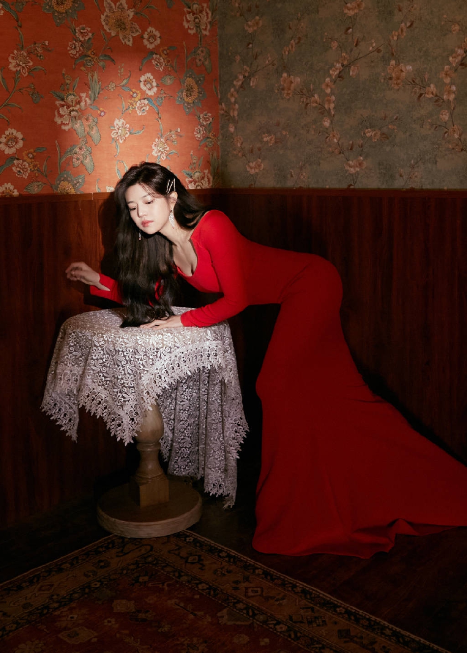 陈妍希穿着一袭红色拖地长裙,她单手扶着墙壁,大秀曼妙的曲线,美艳动人。
