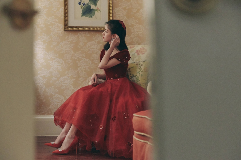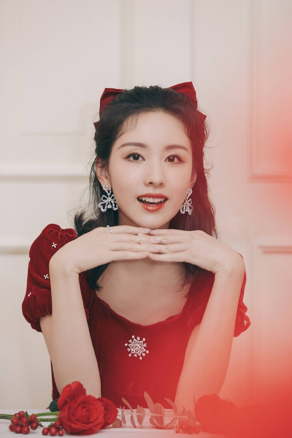 陈都灵穿着一袭红色长裙,她俏脸清丽,秀眸明亮,唇红齿白,美得让人心动。