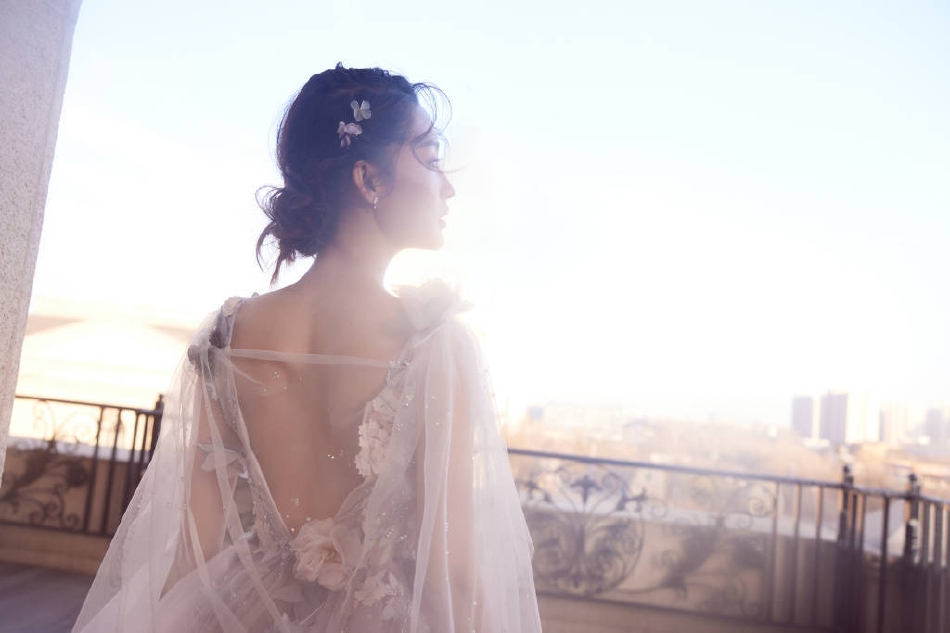 杨颖穿着白色抹胸衣裙,真是曼妙多姿。