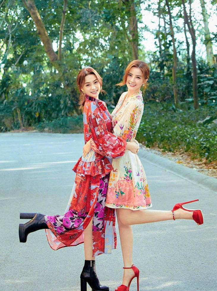 钟欣潼和蔡卓妍抱在一起,一红一黄两位小姐姐,都笑容可人,后翘着单腿,非常甜美可爱。