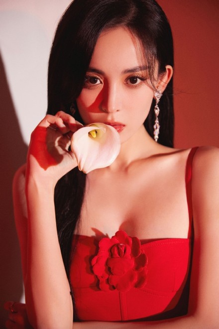 娜扎穿着一袭吊带红裙,她俏脸明媚,秀眸清纯,烈焰红唇,手持鲜花,肌肤白皙,美艳动人。