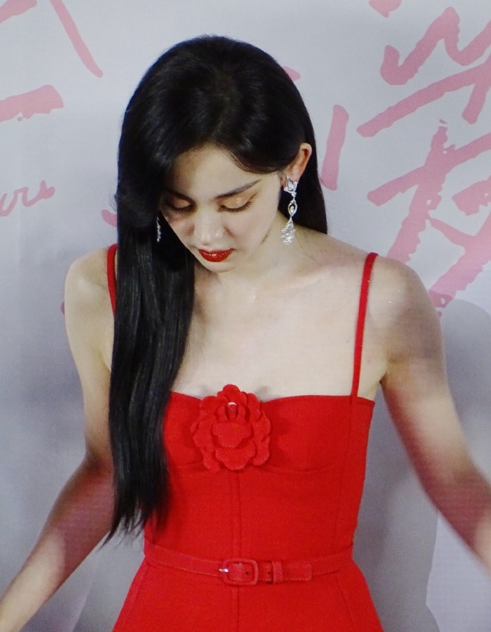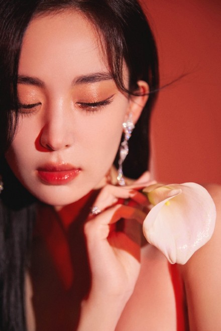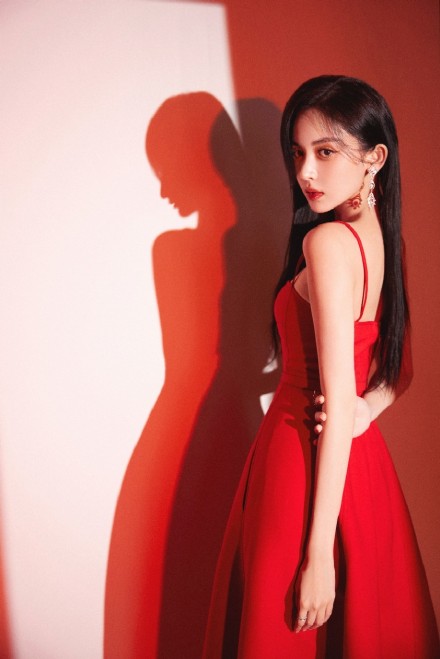 娜扎穿着一袭吊带红裙,她侧身站立亭亭玉立,俏脸清丽,秀眸明媚,烈焰红唇,大秀白皙的香肩,肌肤娇嫩如雪,美得让人心动。