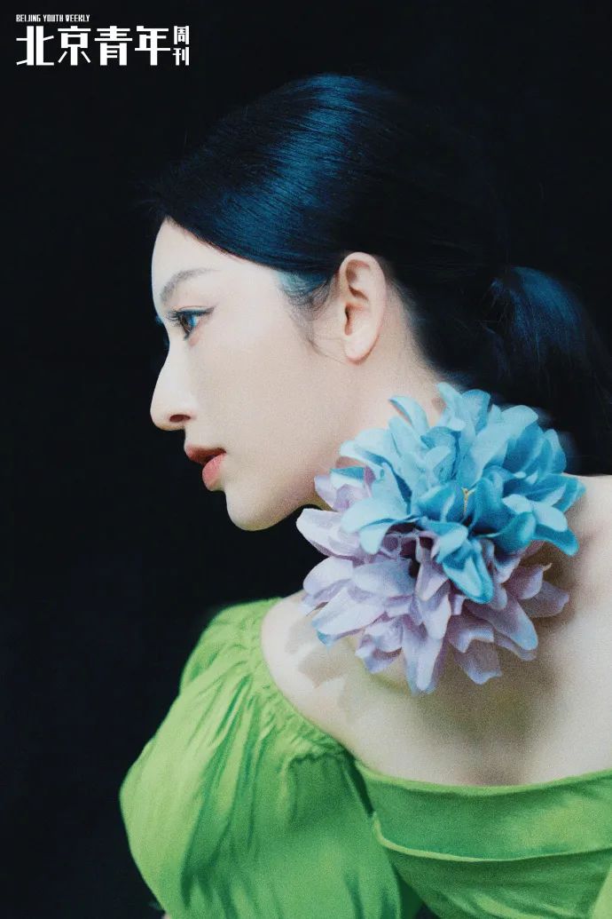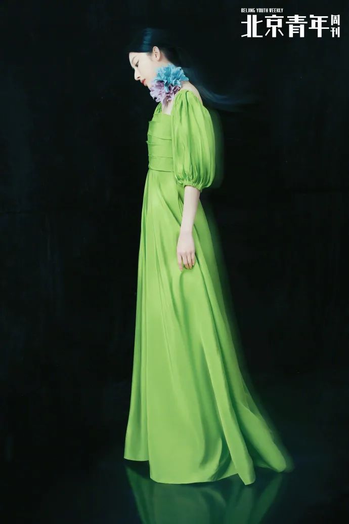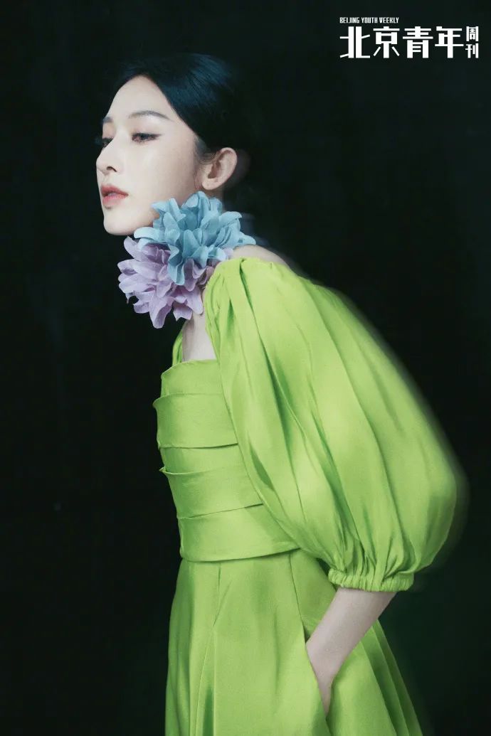 张俪穿着一袭绿色长裙,她俏脸侧视右方,脖子上系着一朵紫色布花,这样的美女还是很靓丽多姿的。