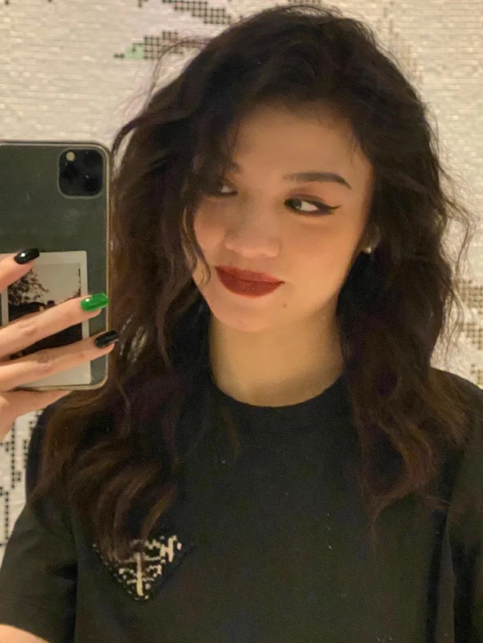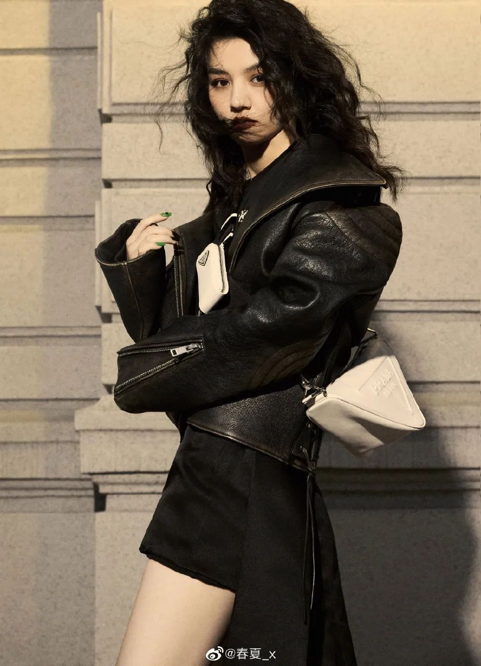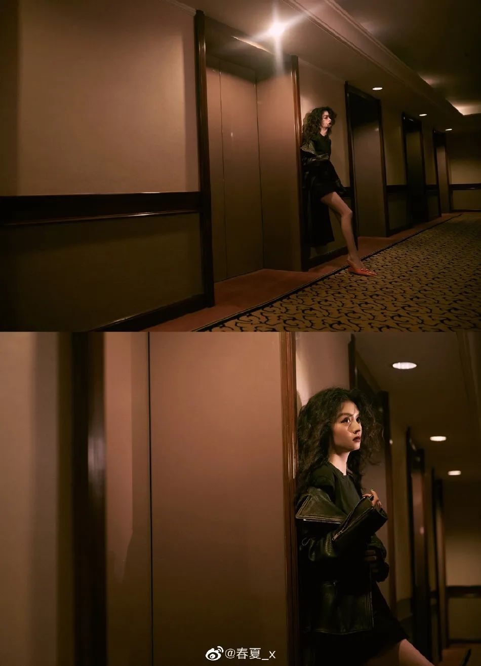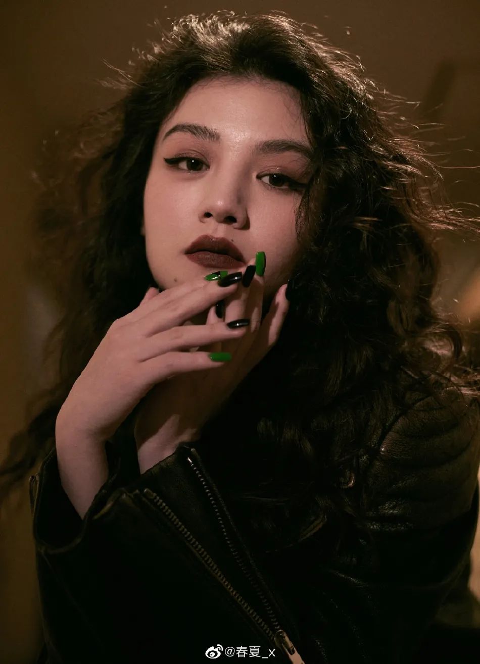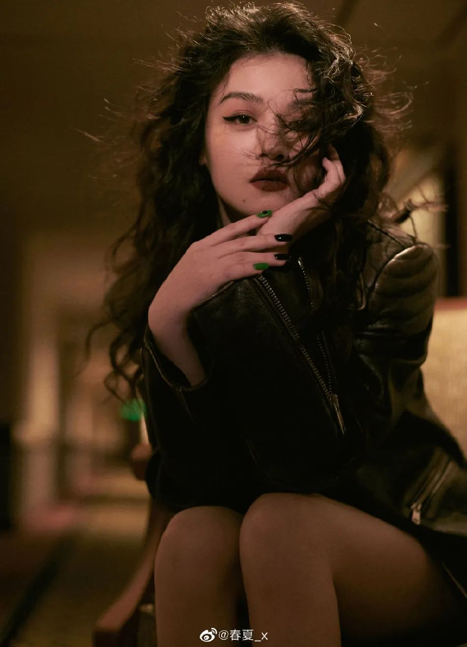 春夏穿着黑色皮衣短裙,她俏脸成熟妩媚,秀眸妖艳,大波浪长发飘逸,露出白皙的大美腿,还是很性感撩人的。