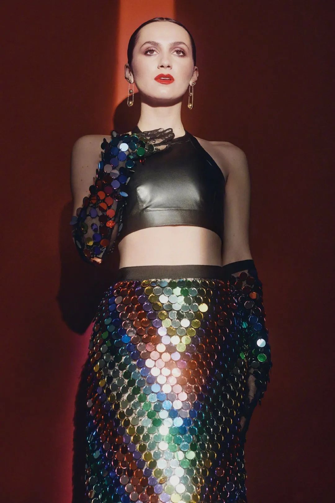 莫德·阿帕图穿着一袭吊带黑皮上衣,搭配亮片花裙,这位女星俏脸成熟妩媚,唇红齿白,大秀白皙的香肩和小肚脐,尽显性感魅力。