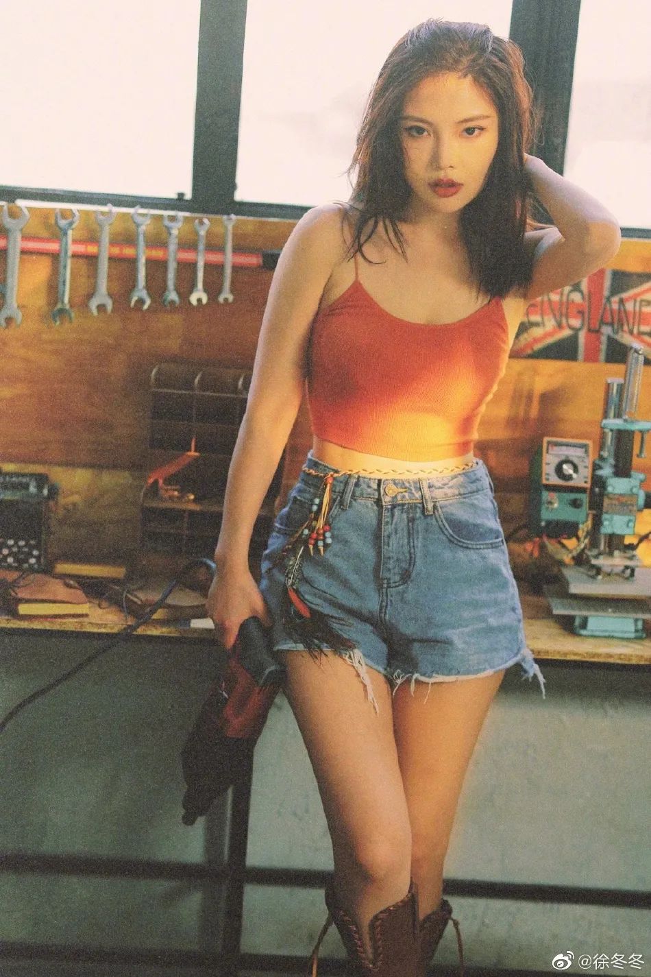 徐冬冬身穿橘红色短款吊带上衣,下搭蓝色牛仔短裤,她俏脸成熟妩媚,露出白皙的大美腿,大秀自己的魔鬼身材,这样的美女谁能不爱?